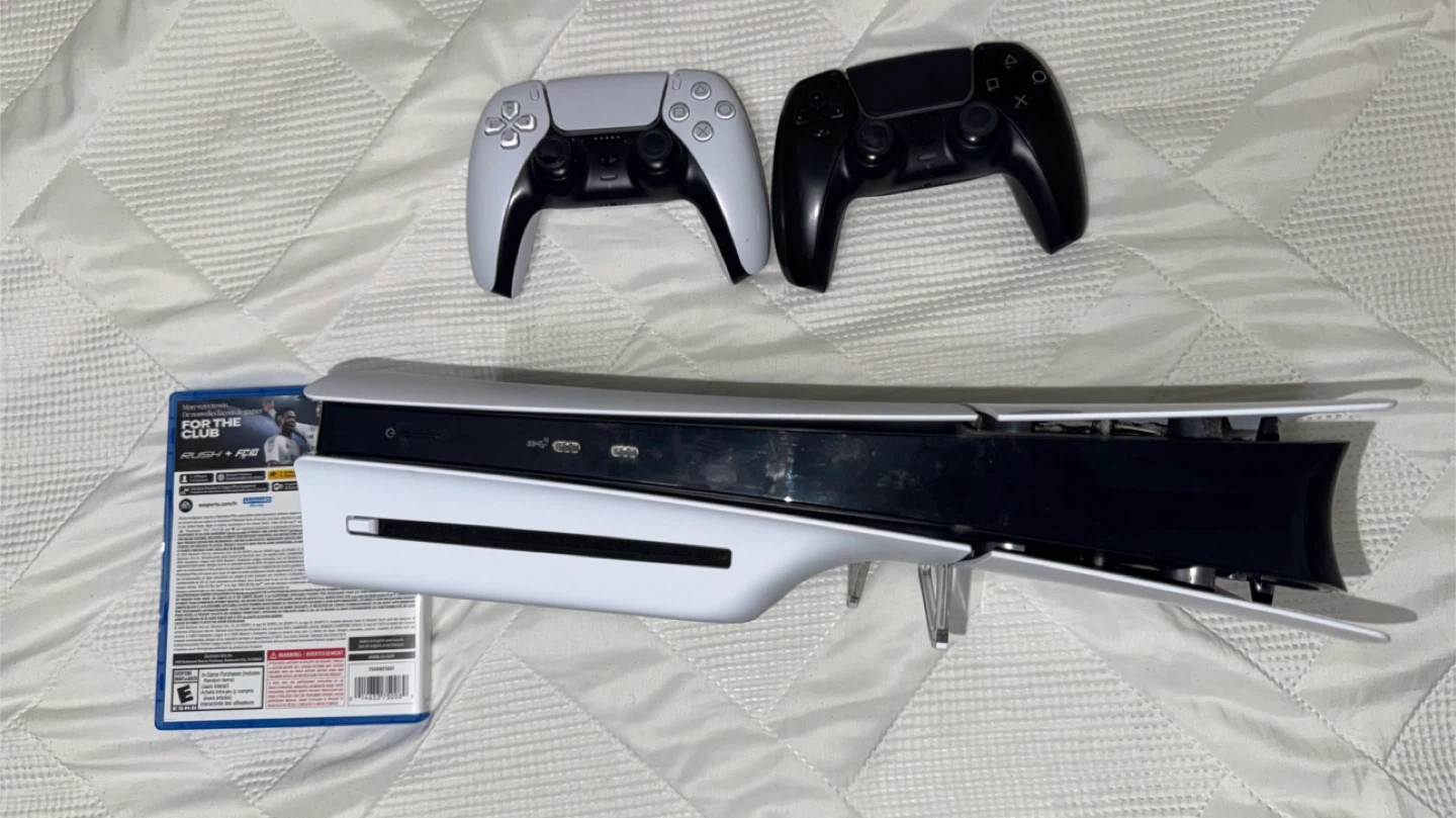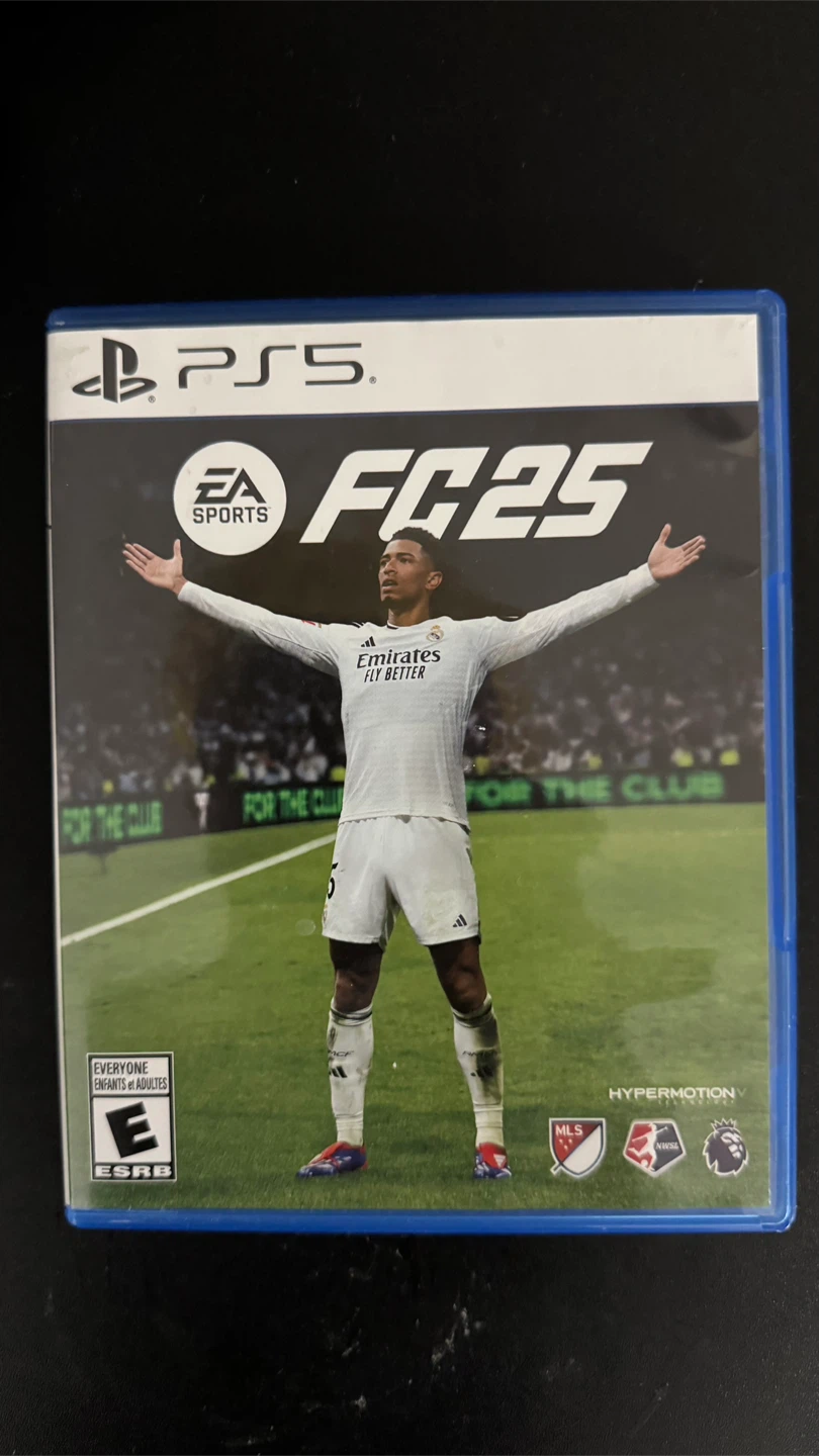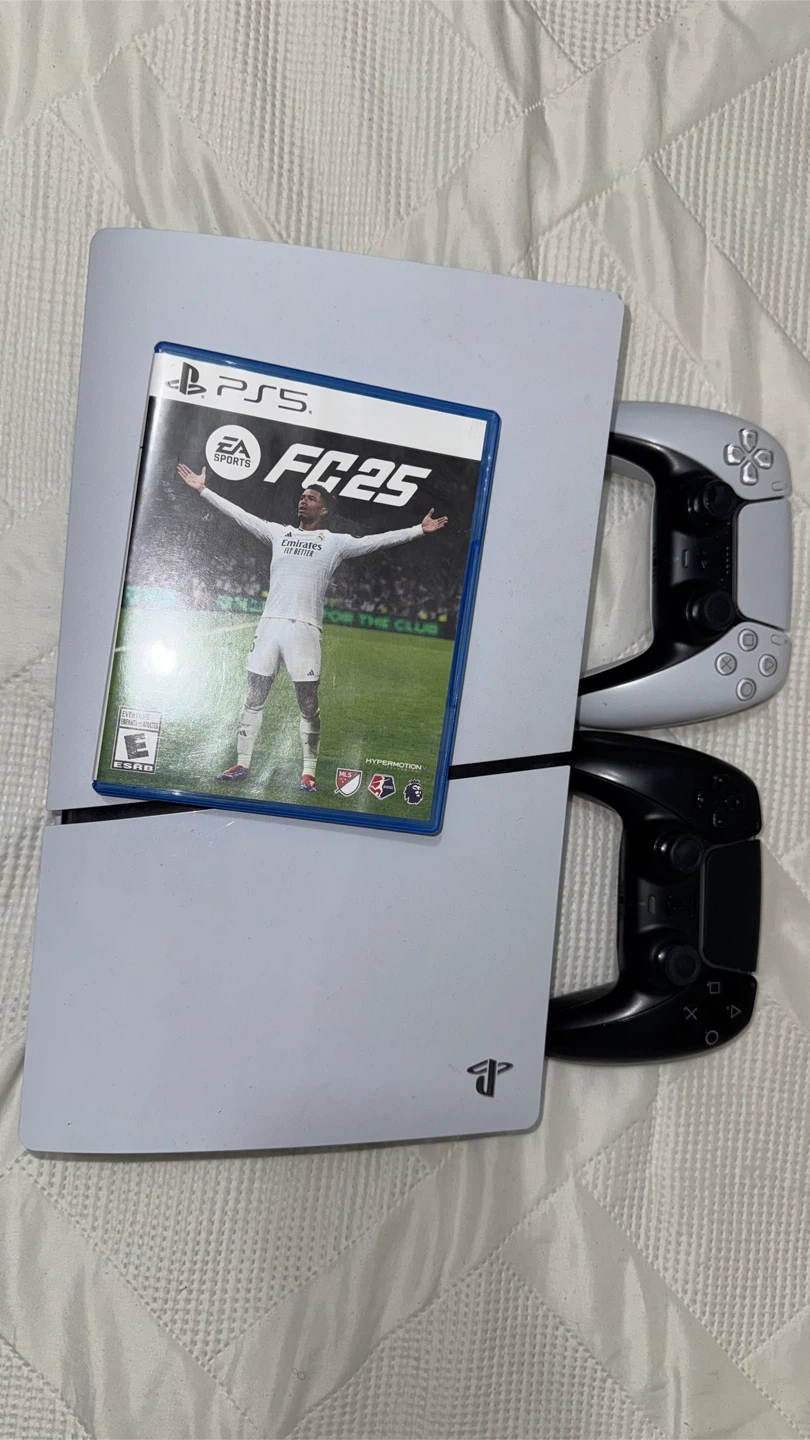 Selling a PlayStation 5 console along with the FC25 game. It comes with two controllers, one white and one black. Perfect for gaming!