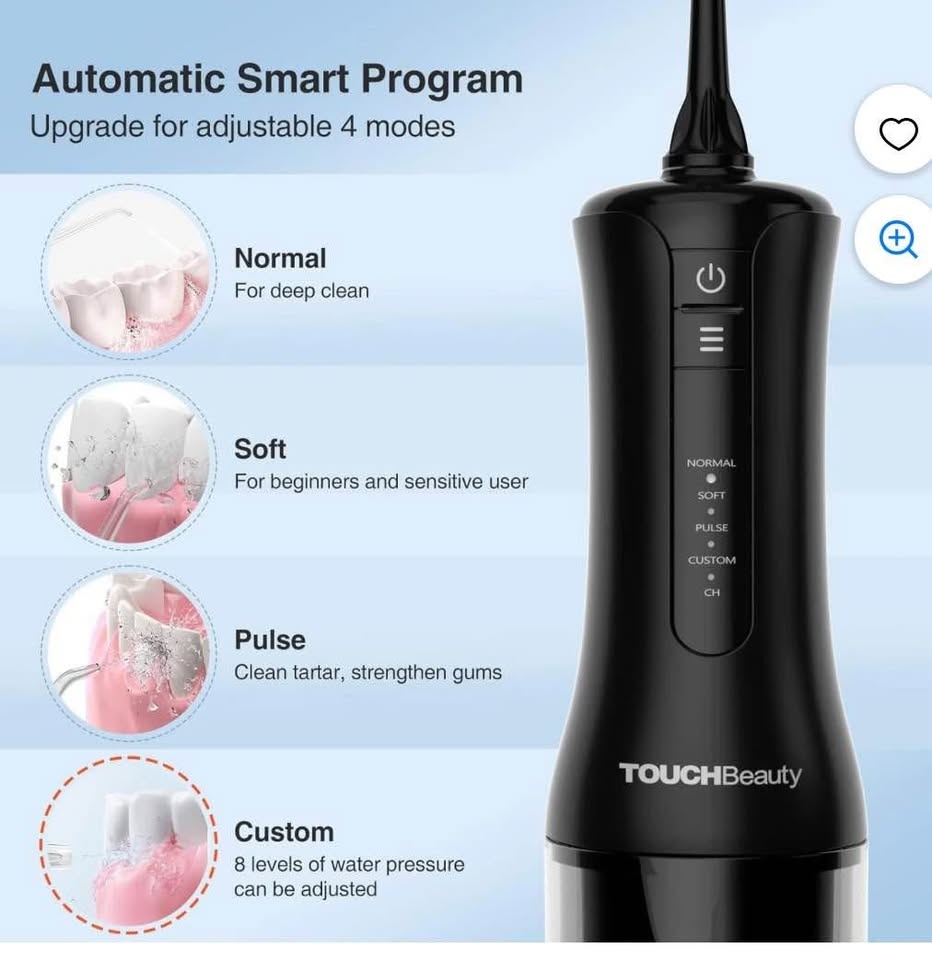 It has upgraded adjustable 4 modes so you can customize your flossing experience. The battery has an impressive 45 days of long life. It's also IPX7 waterproof, so you can confidently use it in the shower or near the sink.