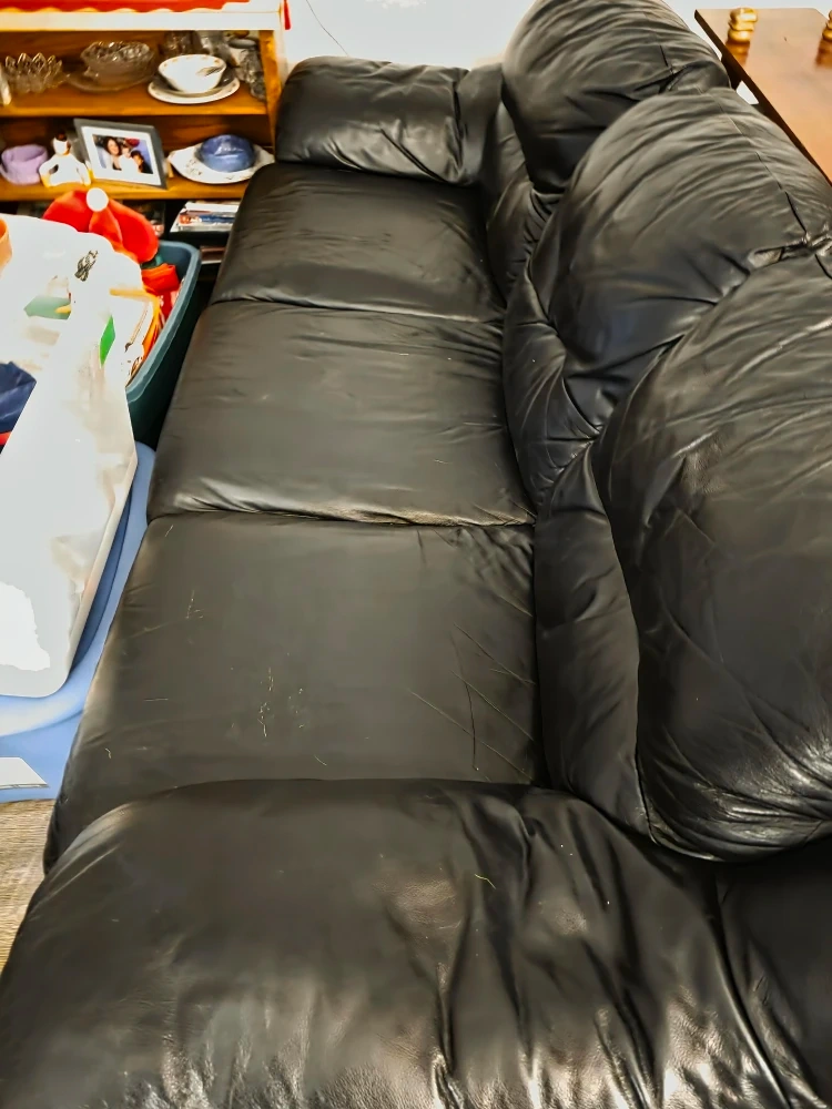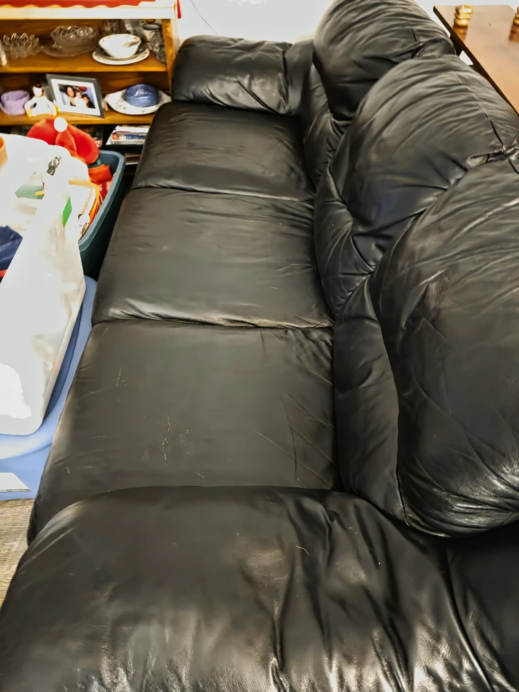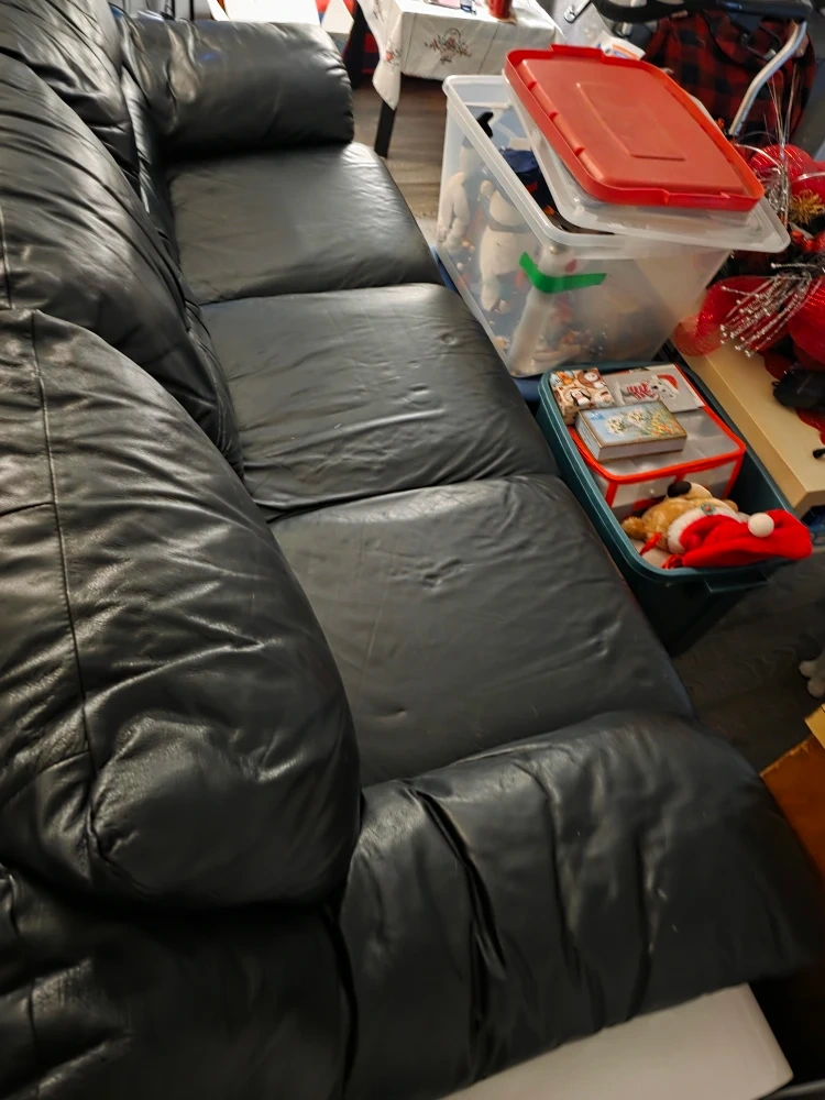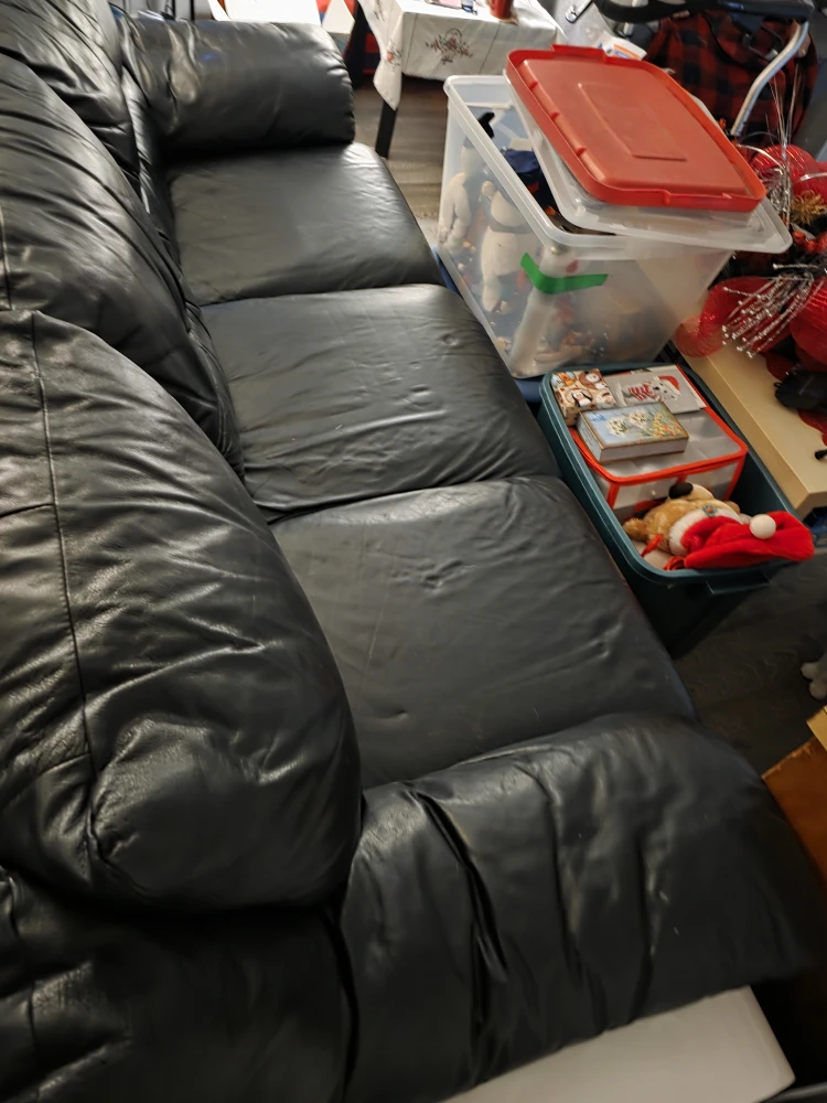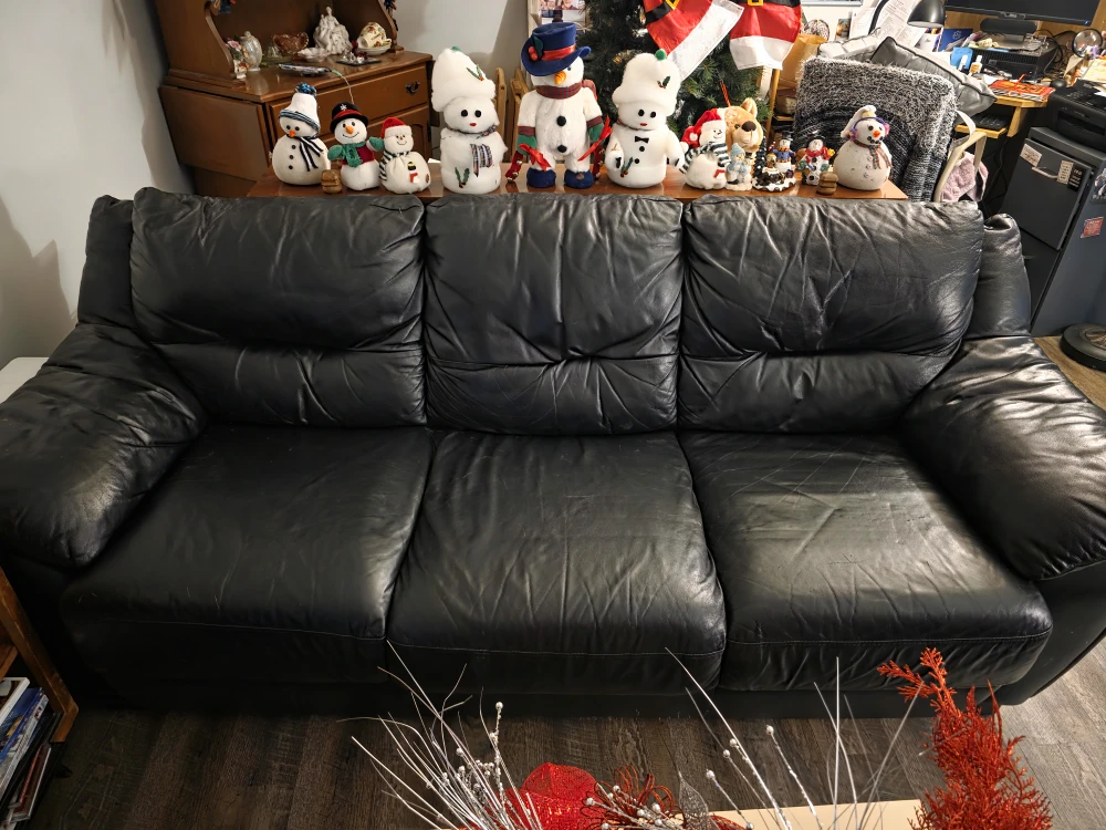 Selling a comfy black leather sofa! It's been gently used and has a lot of life left. Perfect for a living room or den. Please take a look at the pictures to see the condition