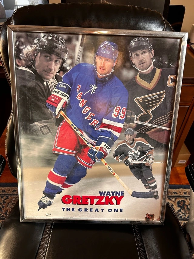 Relive the glory days with this framed Wayne Gretzky poster, a must-have for any hockey fan! This collectible piece features "The Great One" in action, showcasing his iconic moments with the Oilers, Rangers and Blues. The poster is in good condition and ready to hang, adding a touch of hockey history to your space. Size 16β X 20". Cash only.