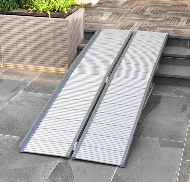 This aluminum wheelchair ramp for doorways supports up to 600 lbs (272 kg), is rust-proof and corrosion-proof.