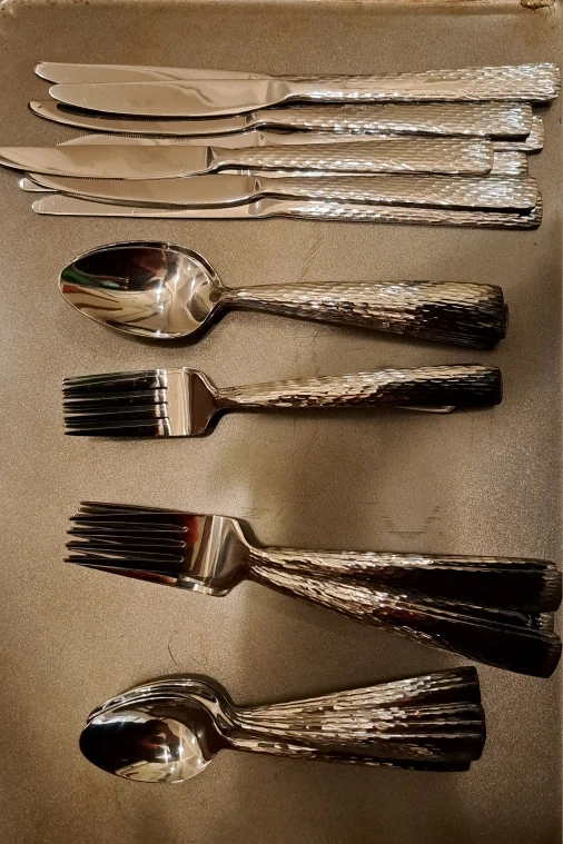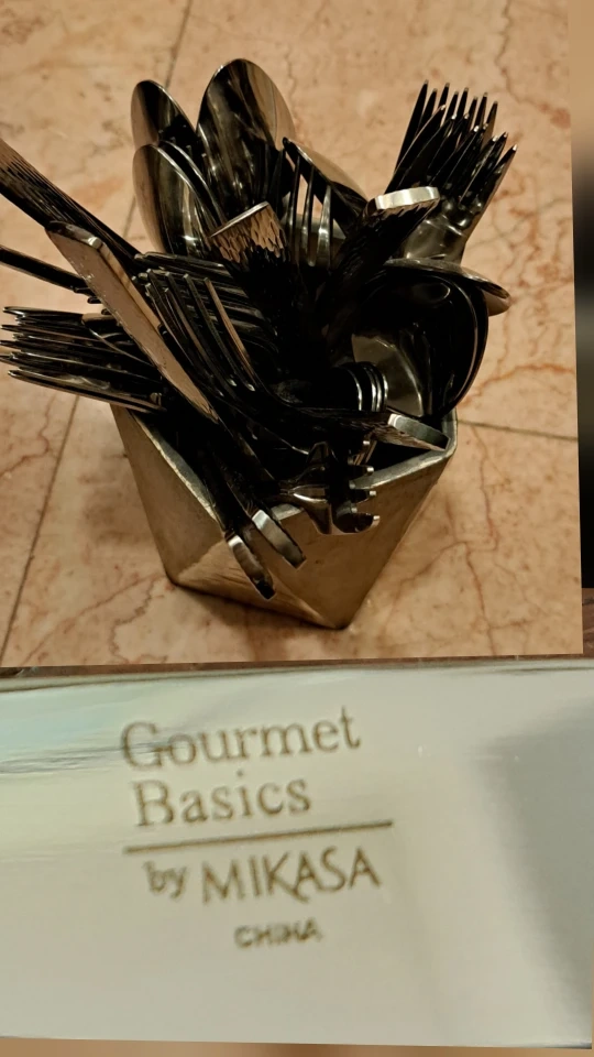 Selling a Mikasa Gourmet Basics silverware set. The set includes knives, forks, and spoons, all with a textured design. Great for everyday use or special occasions