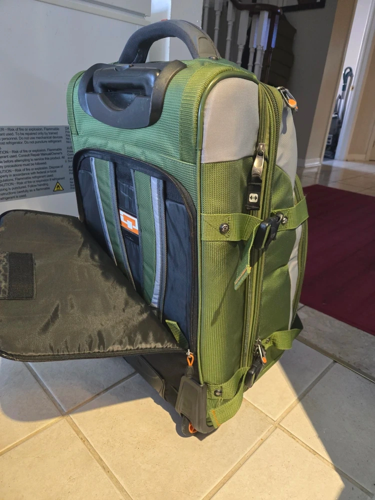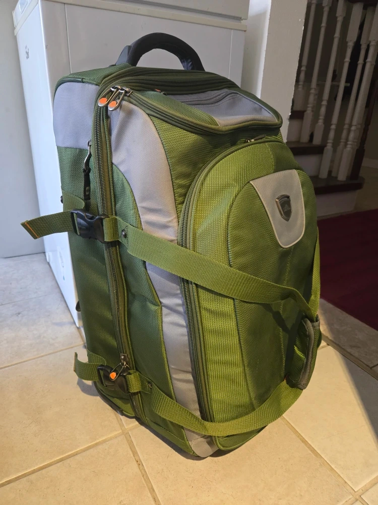 Selling a High Sierra wheeled backpack in great condition! It's a versatile bag, perfect for travel. The colours are a nice green and grey combo. It's got handles to carry it like a duffle bag, telescopic handle for easy wheeled transport, plus backpack straps when you need them. Top and bottom sections can be separated or unzipped to make one large compartment.