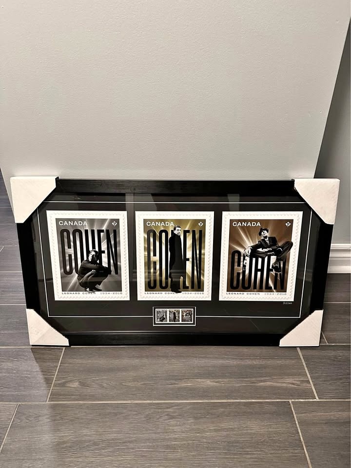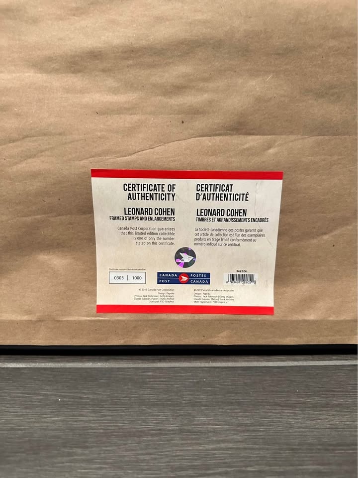 1 / 41 / 4Buy & SellLeonard Cohen Framed StampsLeonard Cohen Framed Stamps$40Framed stamp enlargement featuring Leonard Cohen from the Canadian Mint. Comes with Certificate of Authenticity. Limited edition, number 0303 of 1000. 29x16.5WHERE TO MEETShoppersView MapSELLERverifiedEvanWest Deane54755 reviews0 chats·0 favorites·38 viewsSEND CHAT TO SELLERHi Evan! I’m interested in your listing.Hi Evan! I’m interested in your listing.Get the Karrot app to chatSign In to chat