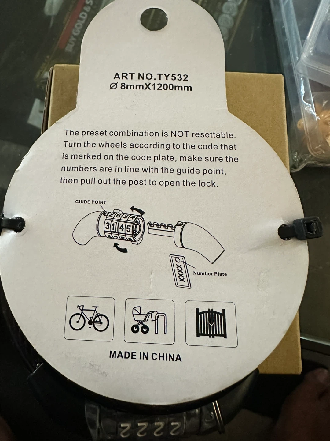 Selling a bike lock cable that's perfect for keeping your bicycle secure! It comes with a preset combination that can't be reset, so make sure to follow the instructions on the code plate to unlock it. The cable is 8mm in diameter and 1200mm long.