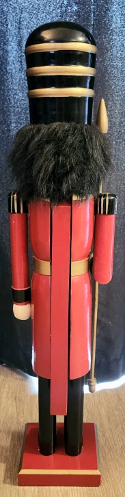 This is a decorative, vintage wooden Nutcracker standing at 24 inches tall. It is in used condition, with some minor wear that adds to its vintage charm.