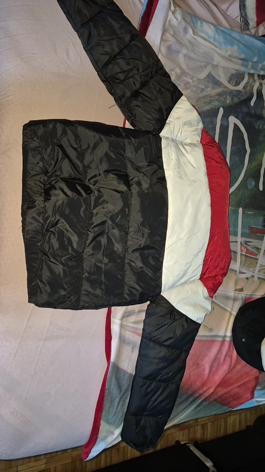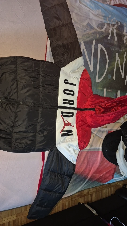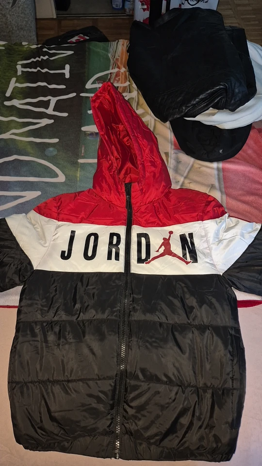 Selling a Jordan puffer jacket in black, white, and red. It's in great condition and ready to use for kids