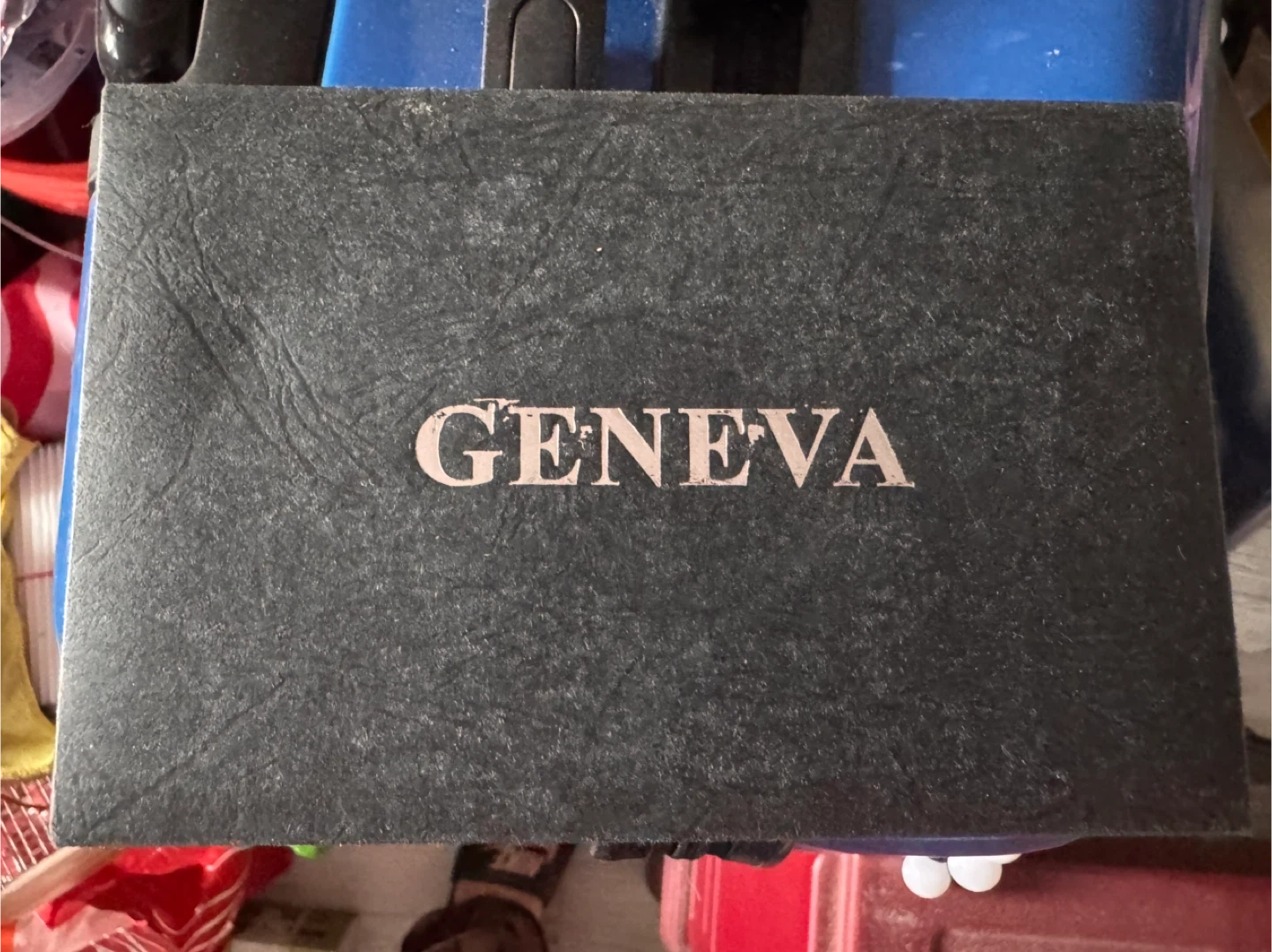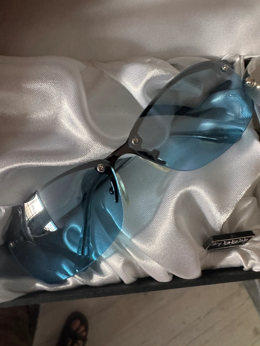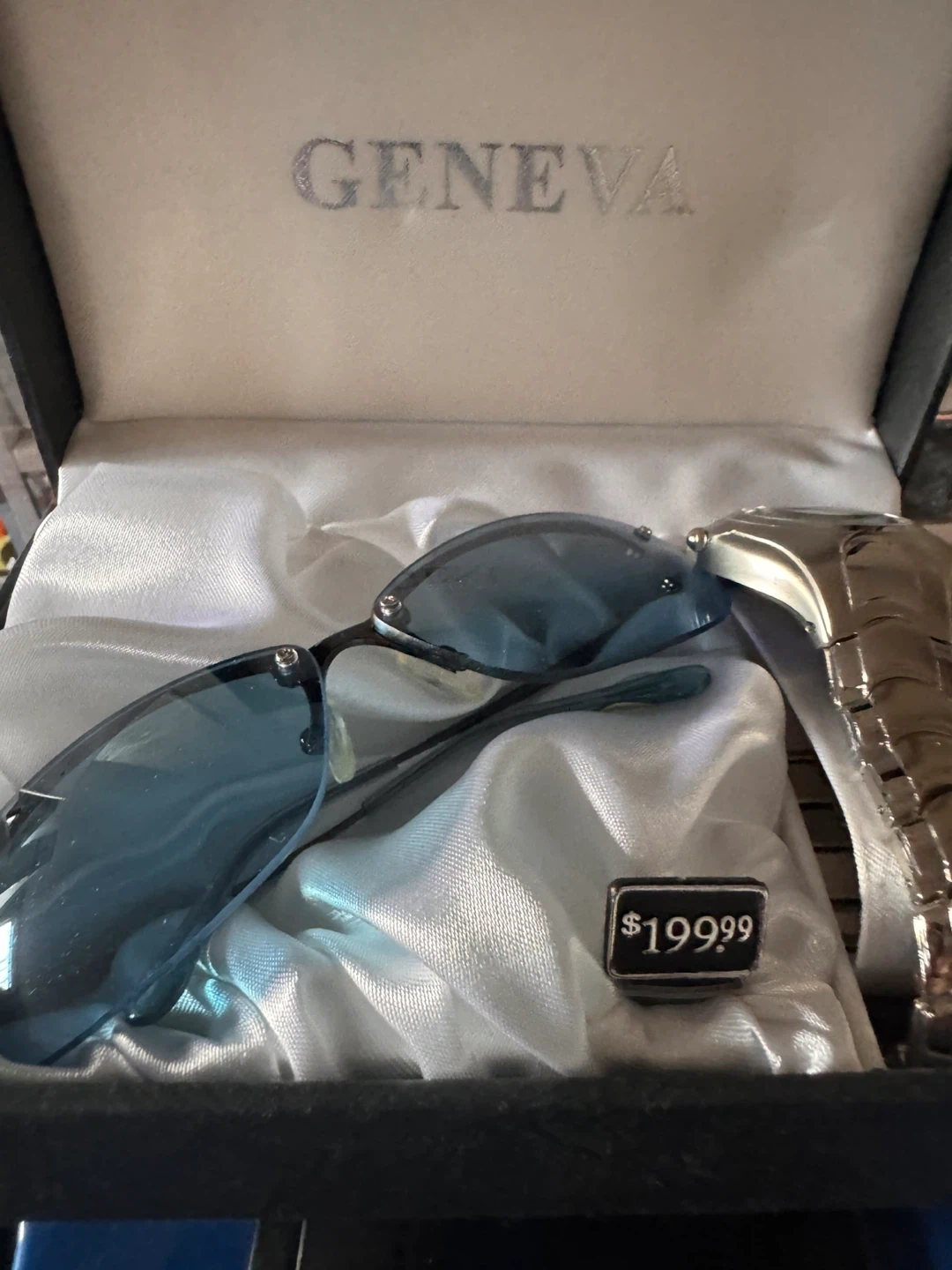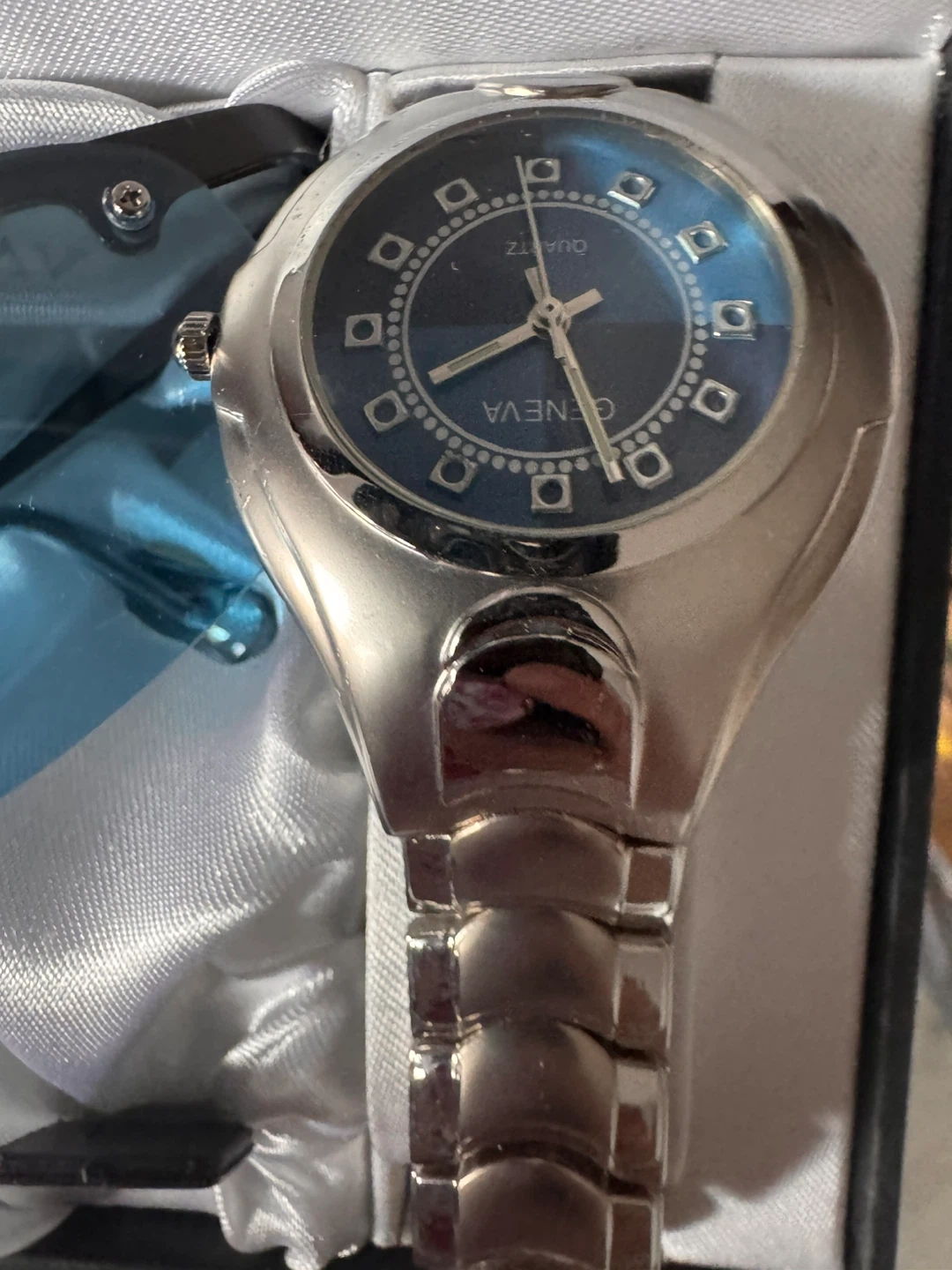 Selling a Geneva watch and sunglasses set. They come in a box. The sunglasses have a blue tint. The watch is silver with a blue face.