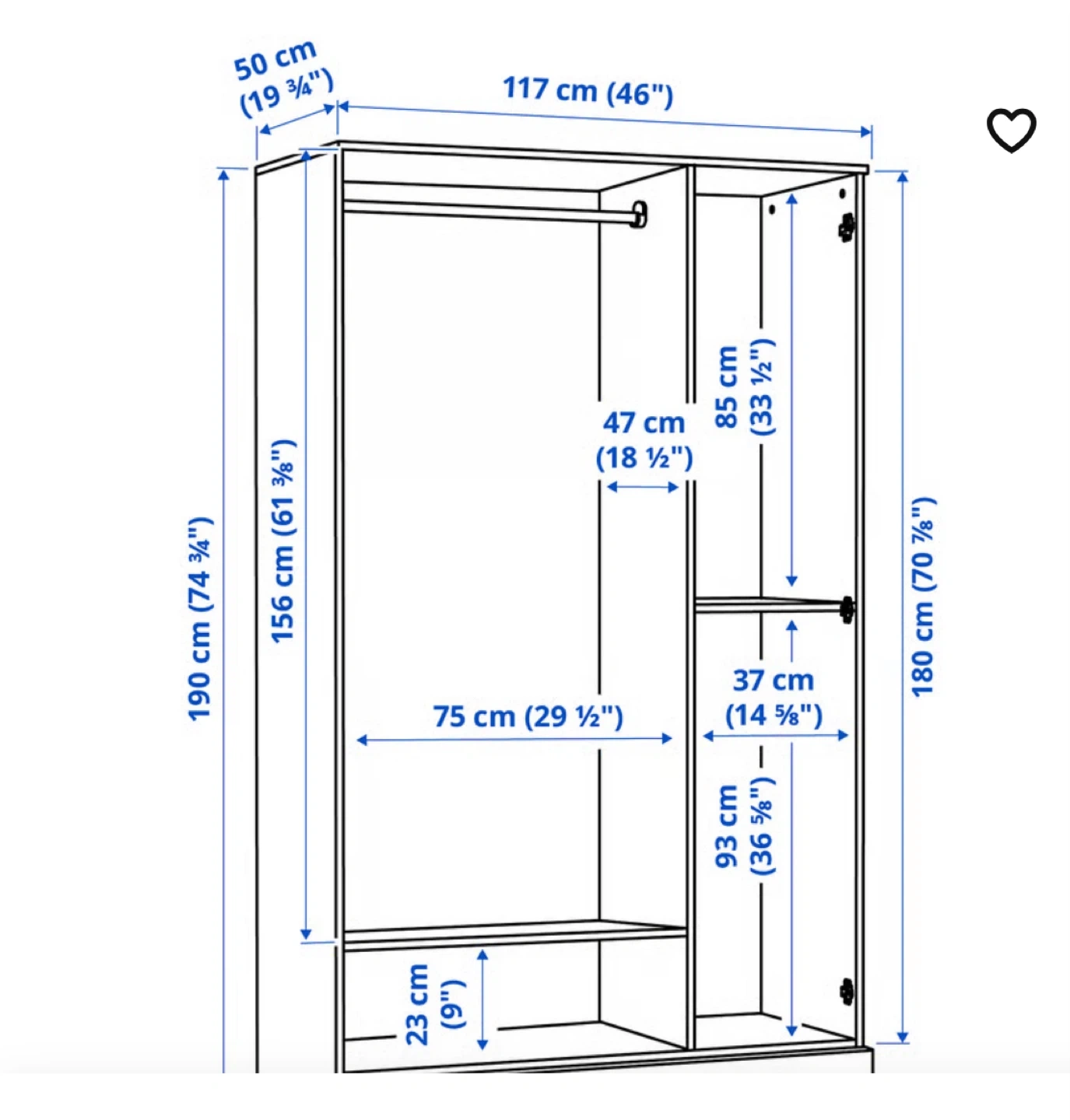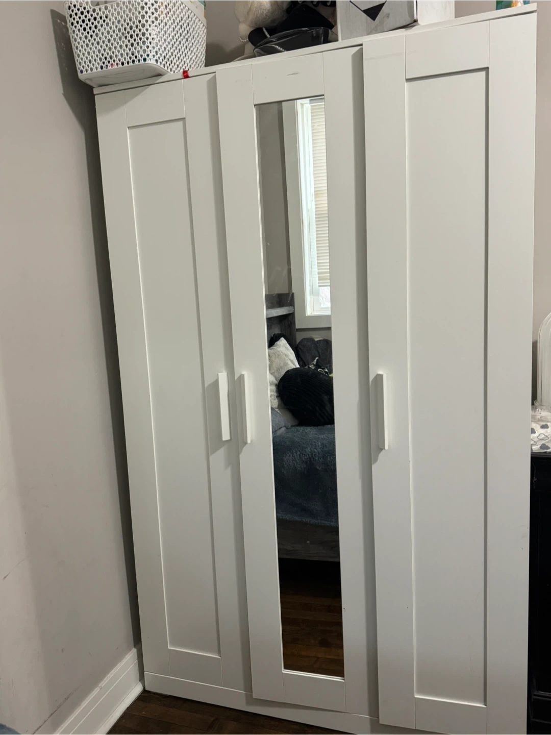 Selling a white IKEA PAX wardrobe in good condition! It's 46 inches wide and has three doors, one of which is a mirror. Great for adding extra storage space to any room. Dimensions are: