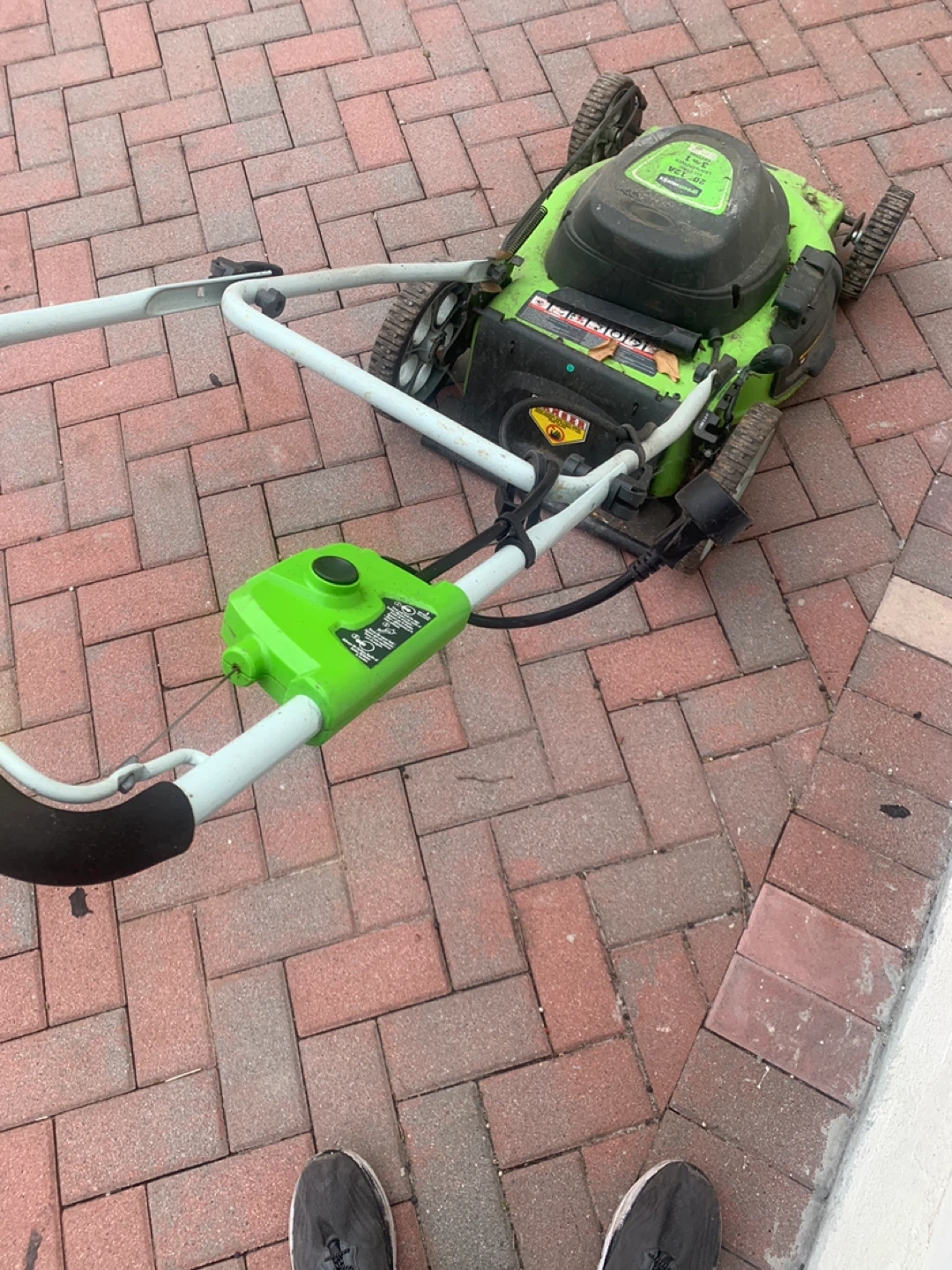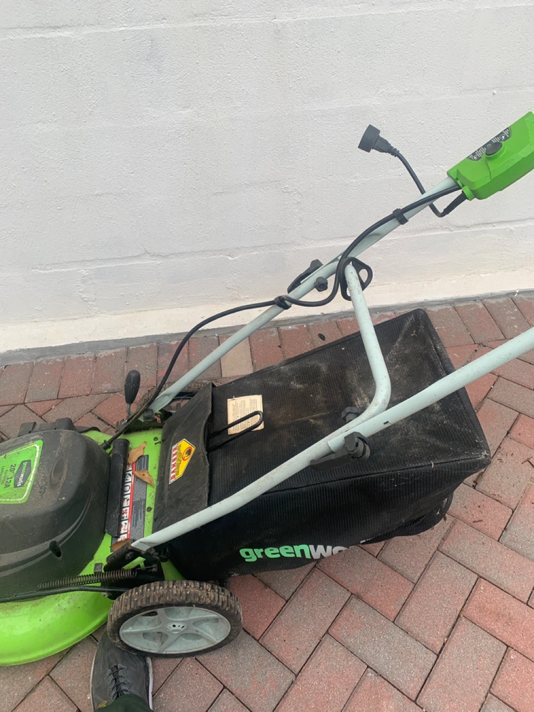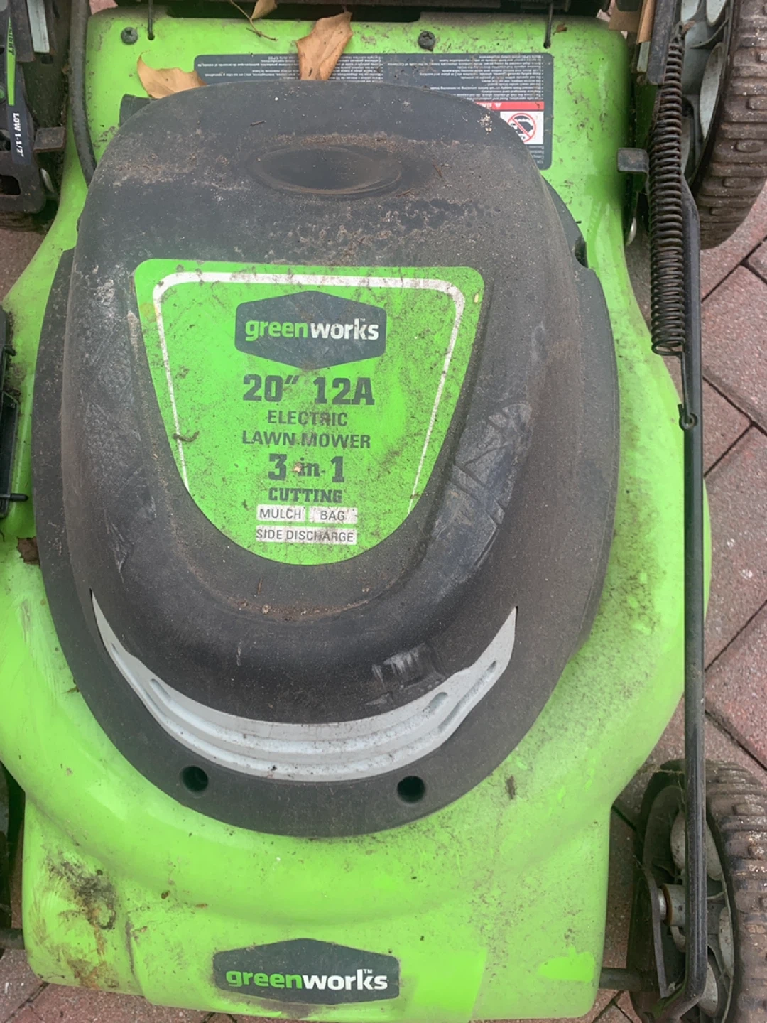 Selling a Greenworks 20" 12A electric lawn mower. It features 3-in-1 cutting with mulch, bag, and side discharge options. It shows some signs of use, but it's still in good working condition! Havent used it in years but it’s been the garage during those times when not in use