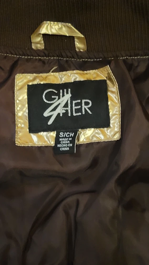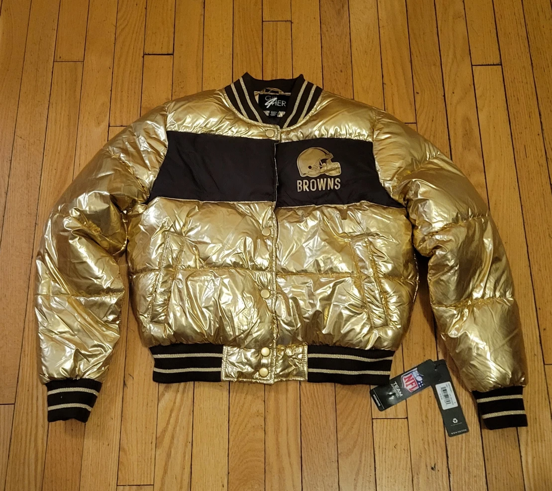 Selling a GIII 4Her Cleveland Browns puffer jacket. It's a shiny gold color with black accents and the Browns logo. It's a size small.
