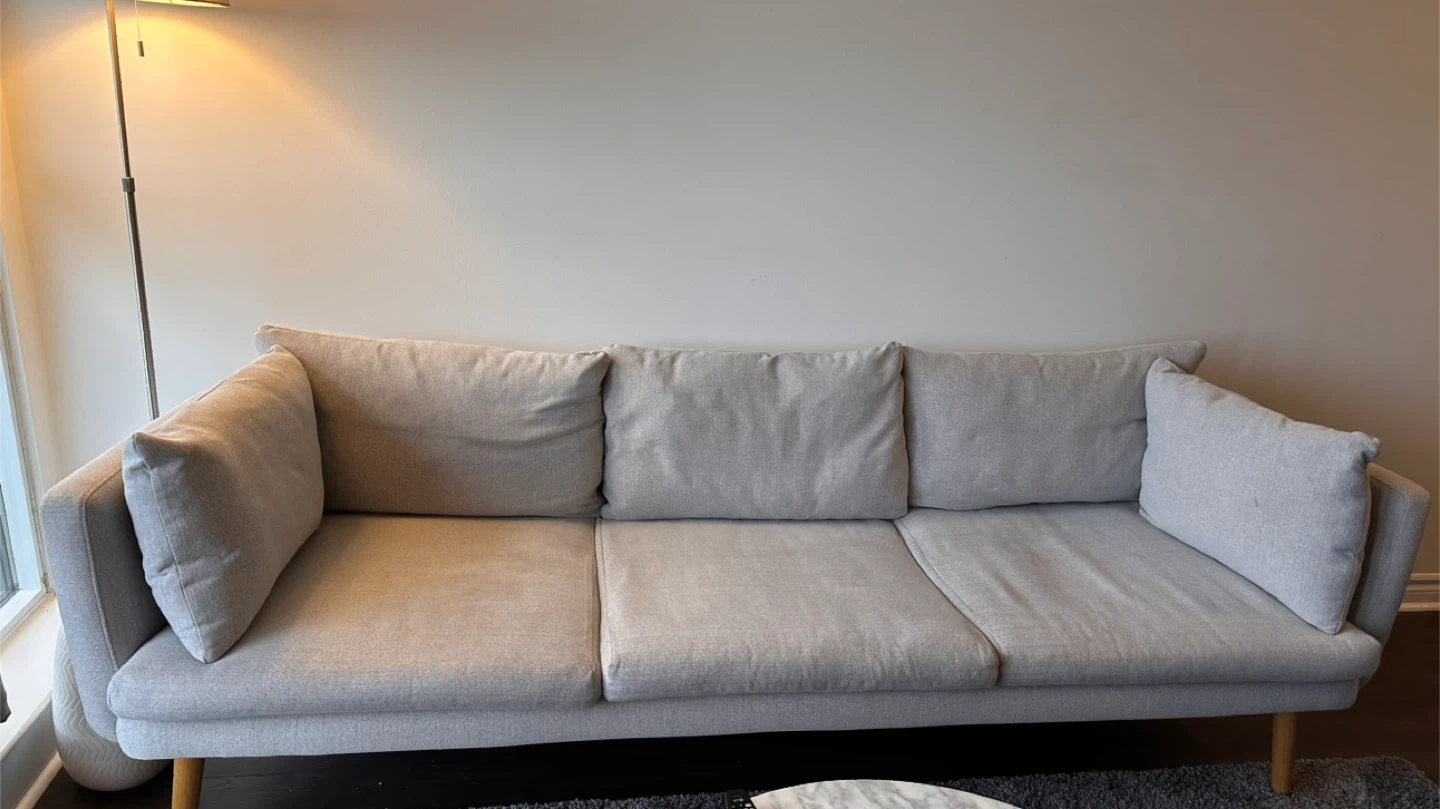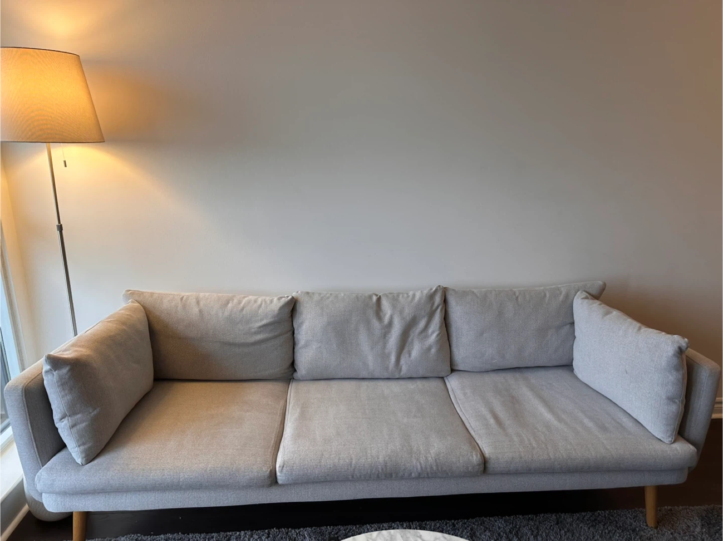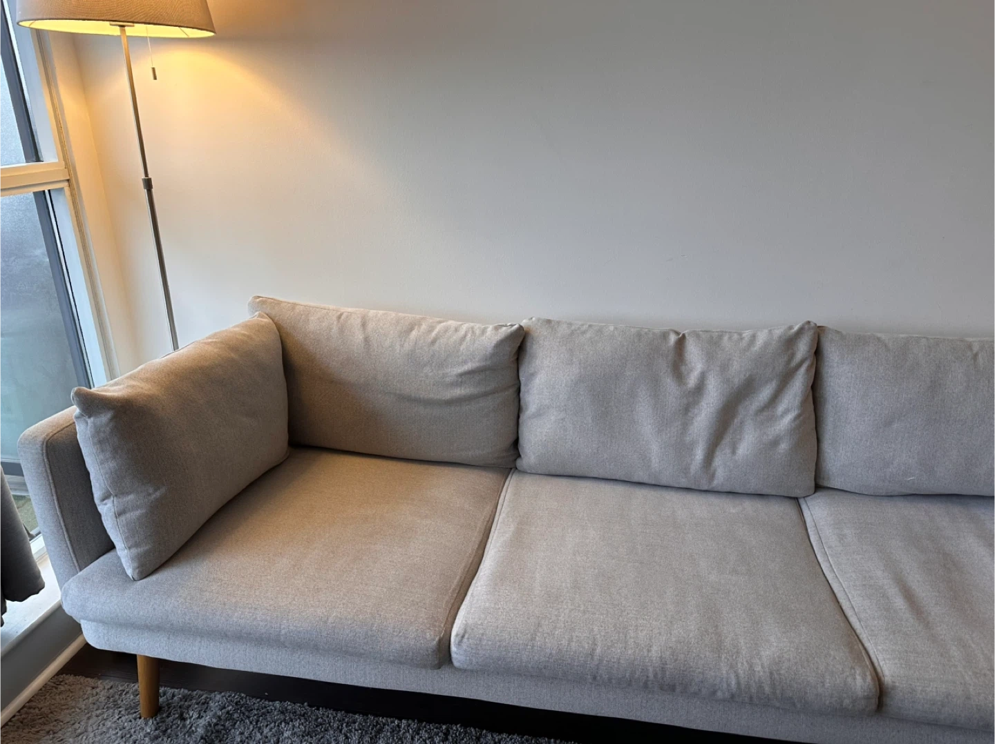 Selling a comfy beige sofa! It's in good condition and has a classic look that would fit well in any living room. Legs are pure wood. 2 cushions will come with the sofa free.