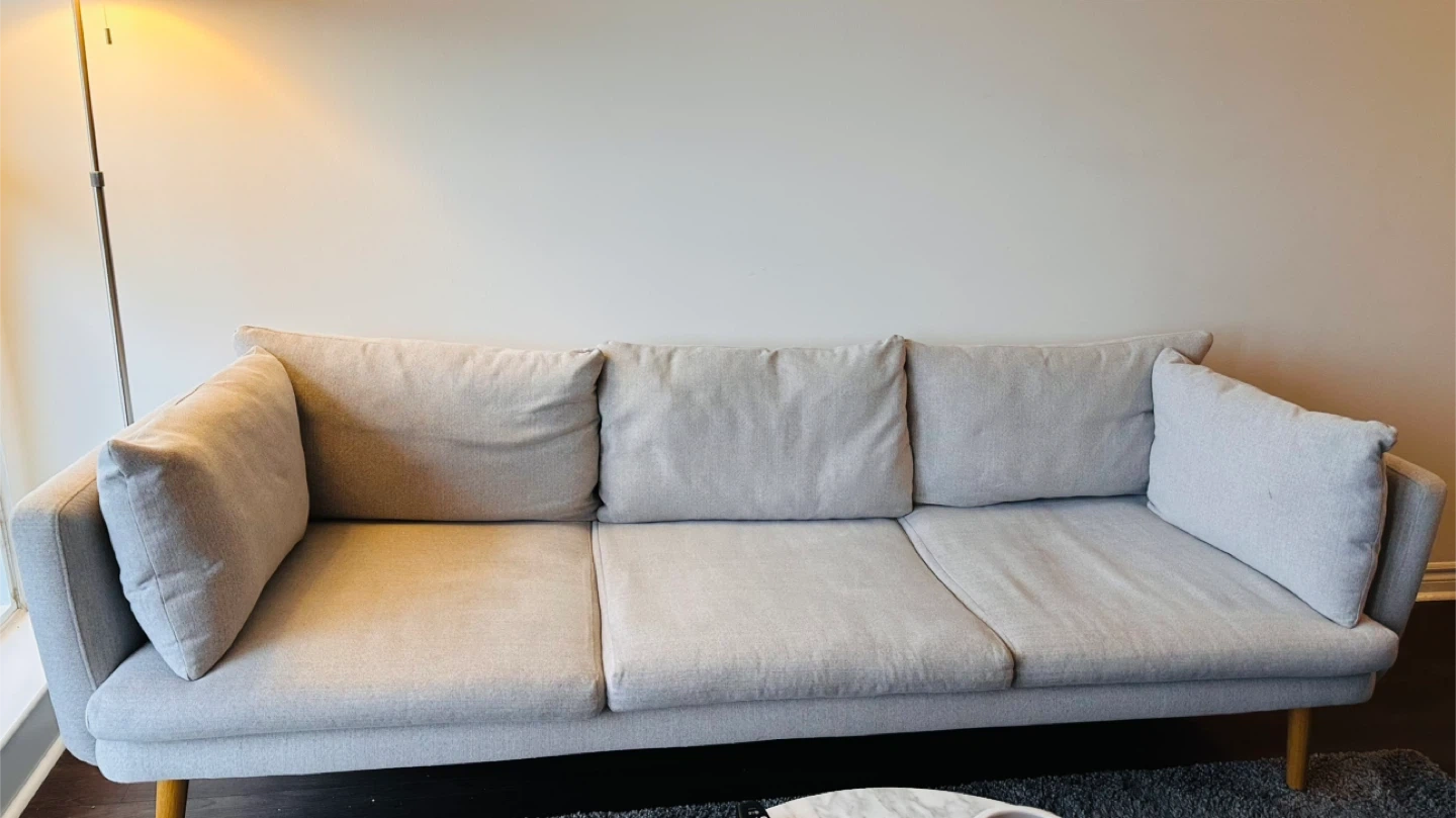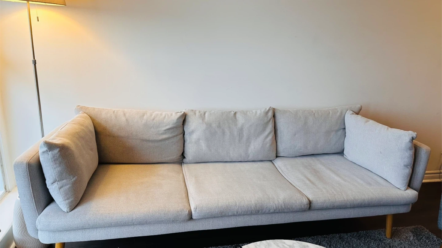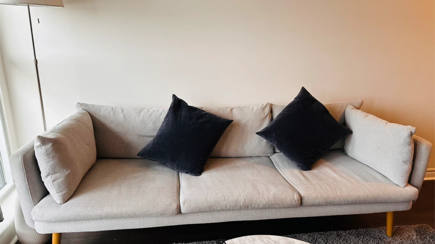 Selling a comfy beige sofa! It's in good condition and has a classic look that would fit well in any living room. Legs are pure wood. 2 cushions will come with the sofa free.