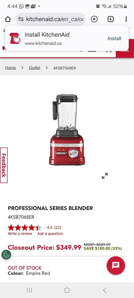 1 / 41 / 4Buy & SellKitchenAid Professional Series BlenderKitchenAid Professional Series Blender$299KitchenAid Professional Series blender, red color, 3.5 peak HP motor. New original price is $500WHERE TO MEETCheck LocationView MapSELLER111005Erindale687 reviews0 chats·0 favorites·17 viewsSEND CHAT TO SELLERHi 111005! I’m interested in your listing.Hi 111005! I’m interested in your listing.Get the Karrot app to chatSign In to chat