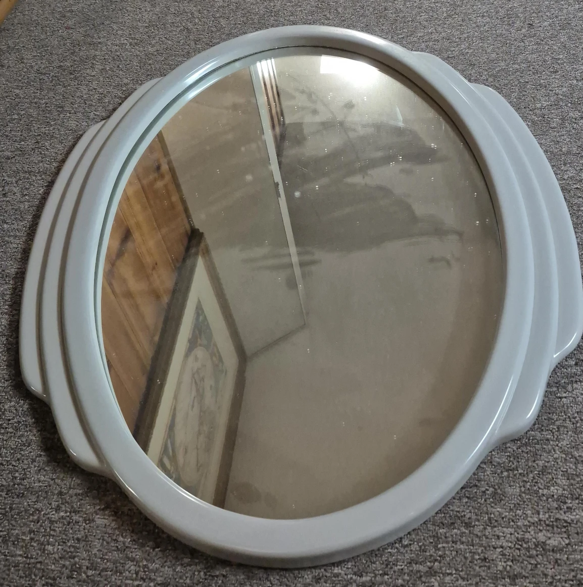 Selling a round wall mirror with a gray frame. It's in great condition and would look lovely in any room! The frame has a unique design that adds a touch of elegance. Perfect for adding some light and space to your home