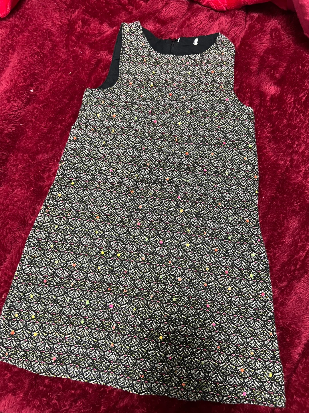 Here's a cute patterned sleeveless dress! It features a black and white design with small pops of colour throughout. Perfect for a casual day out or dressed up for an evening event