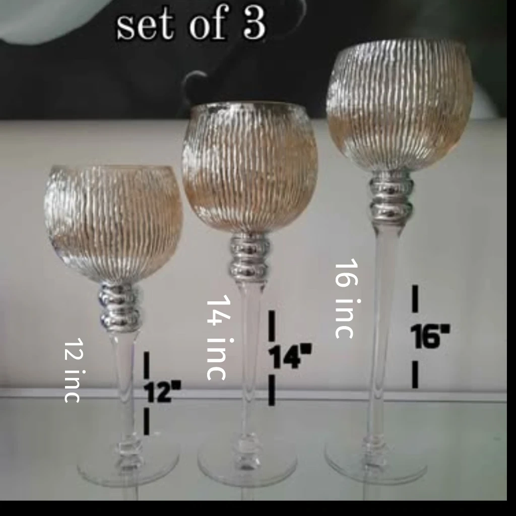 Selling a set of three elegant gold glass candle holders! They come in varying heights: 12 inches, 14 inches, and 16 inches. Perfect for adding a touch of sophistication to any room