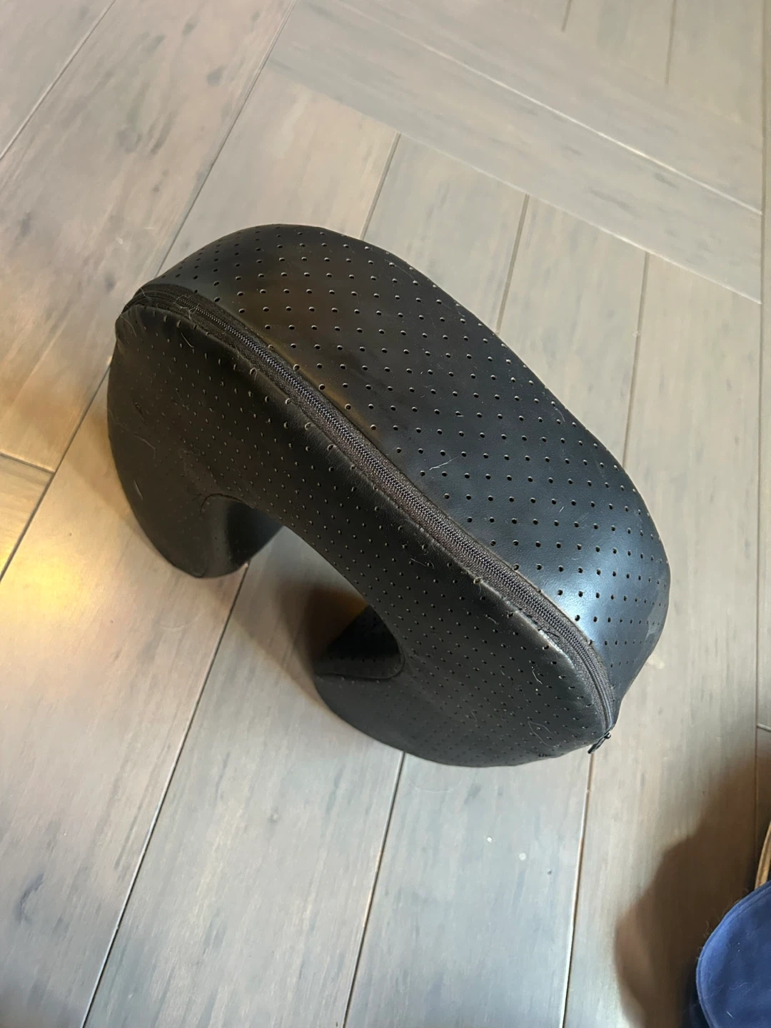 This is a black memory foam leather travel neck pillow designed to provide comfort and support during travel. This item is in good used condition.