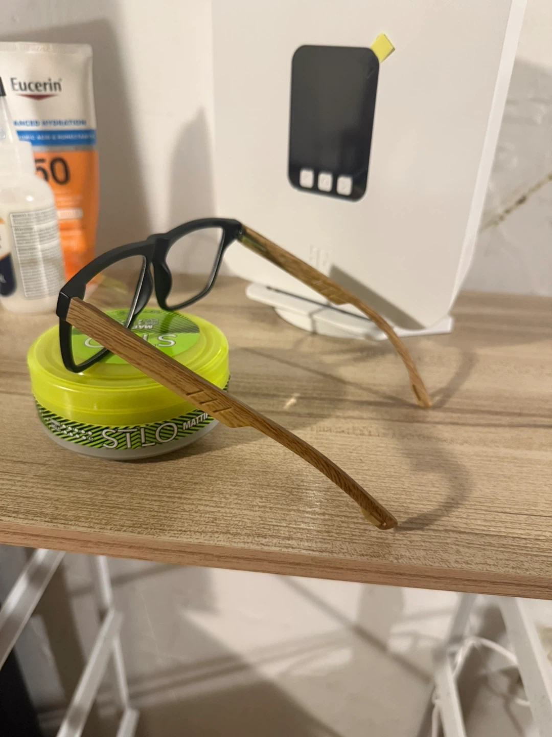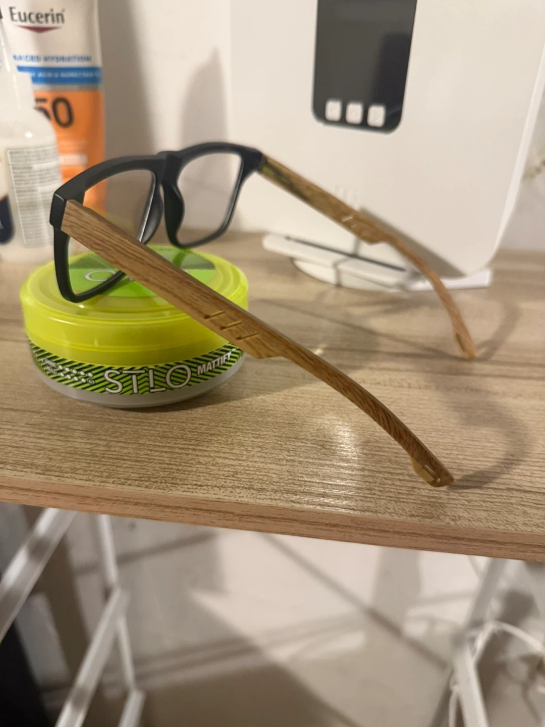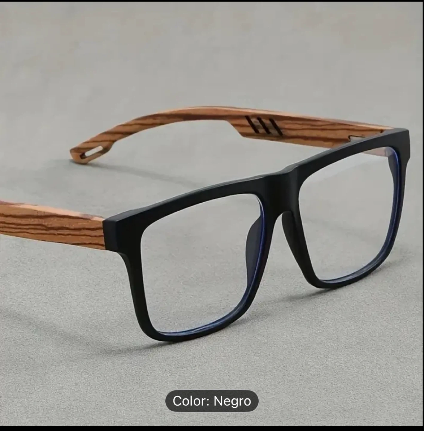 Selling a pair of glasses with a stylish black frame and unique wood grain temples. These glasses are in great condition and ready for a new home! The color is "Negro" (Black). Marco cuadrado negro y solas de color madera . NUEVAS . Sin accesorios caja o limpiador de lente