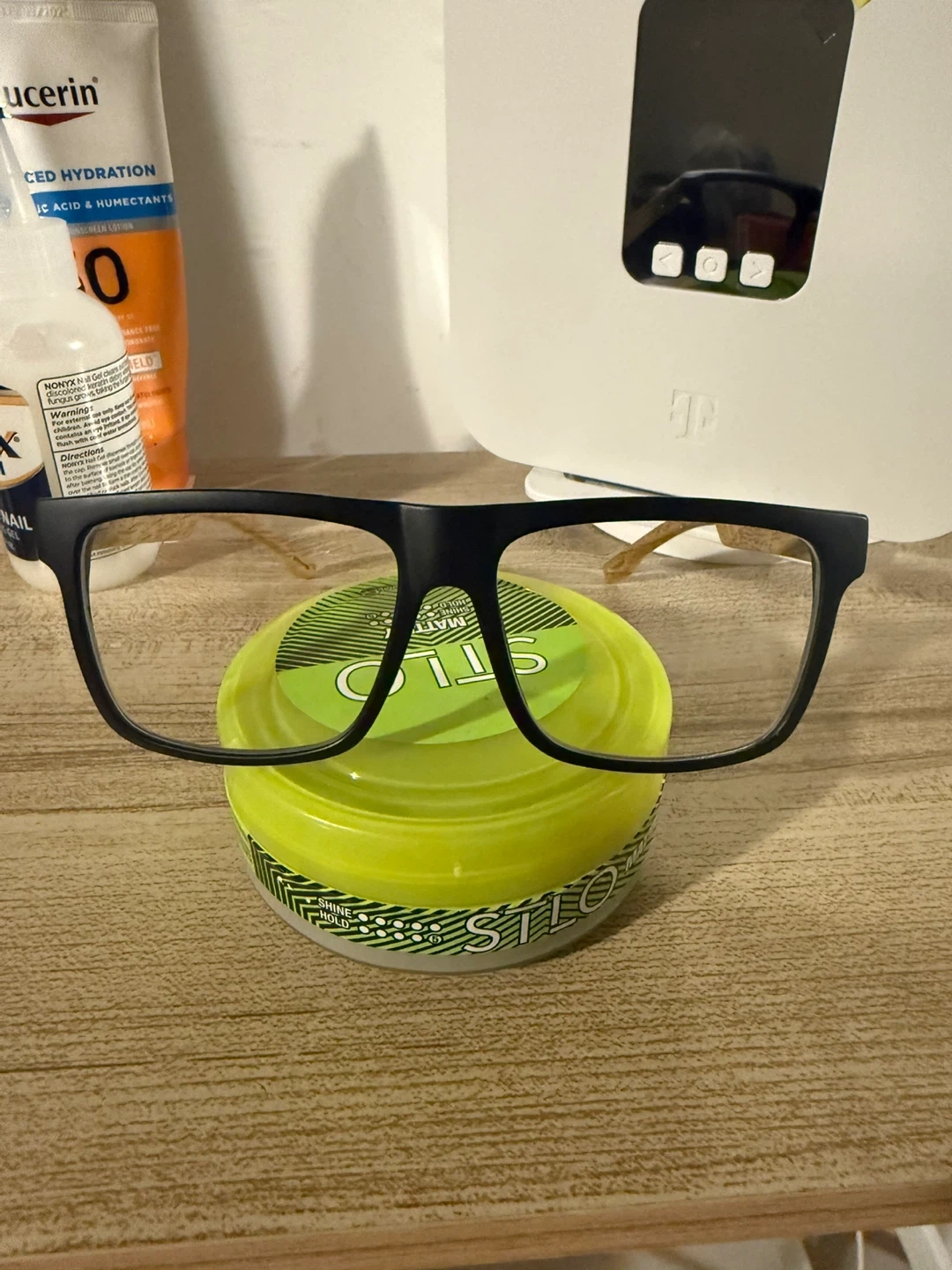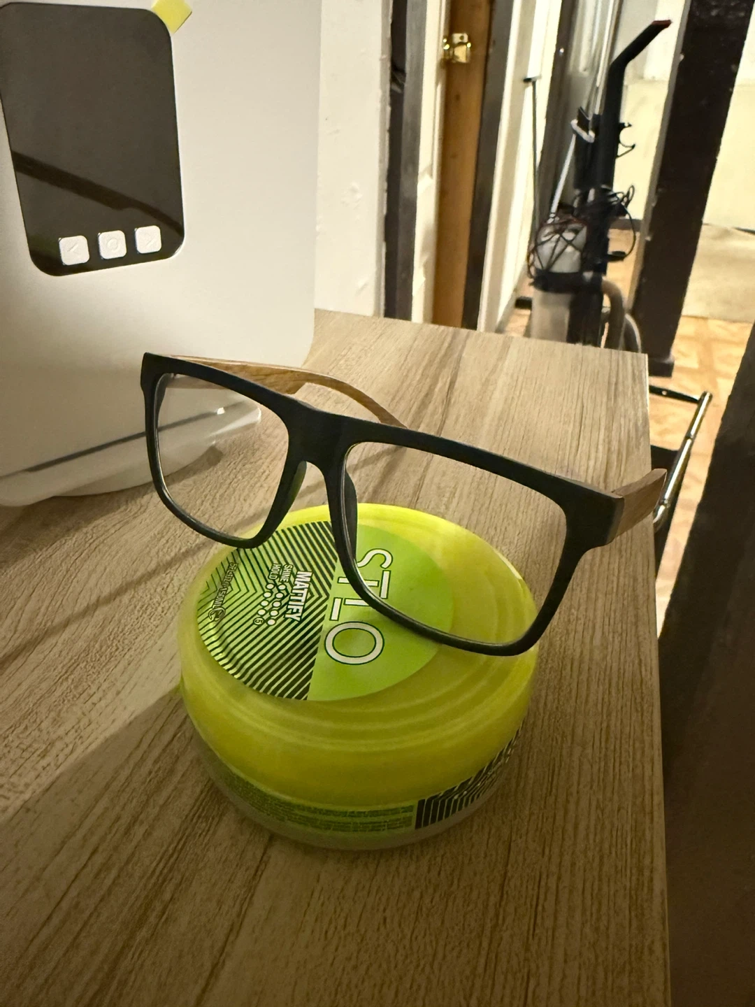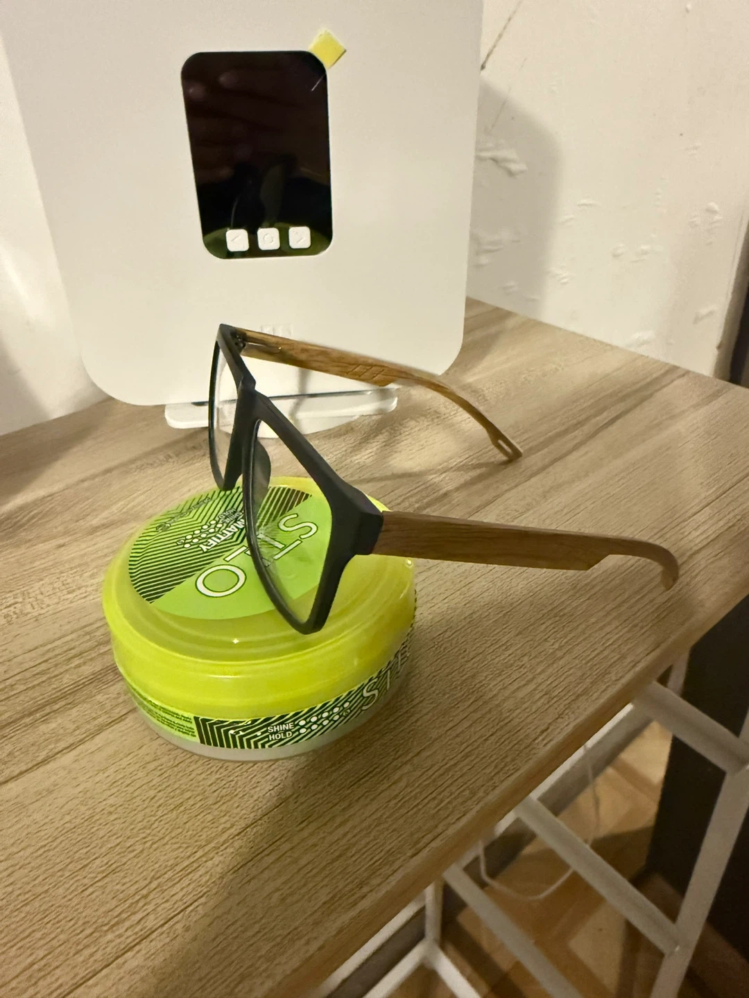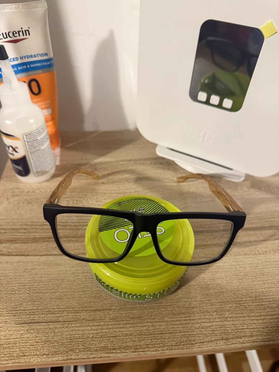 Selling a pair of glasses with a stylish black frame and unique wood grain temples. These glasses are in great condition and ready for a new home! The color is "Negro" (Black). Marco cuadrado negro y solas de color madera . NUEVAS . Sin accesorios caja o limpiador de lente