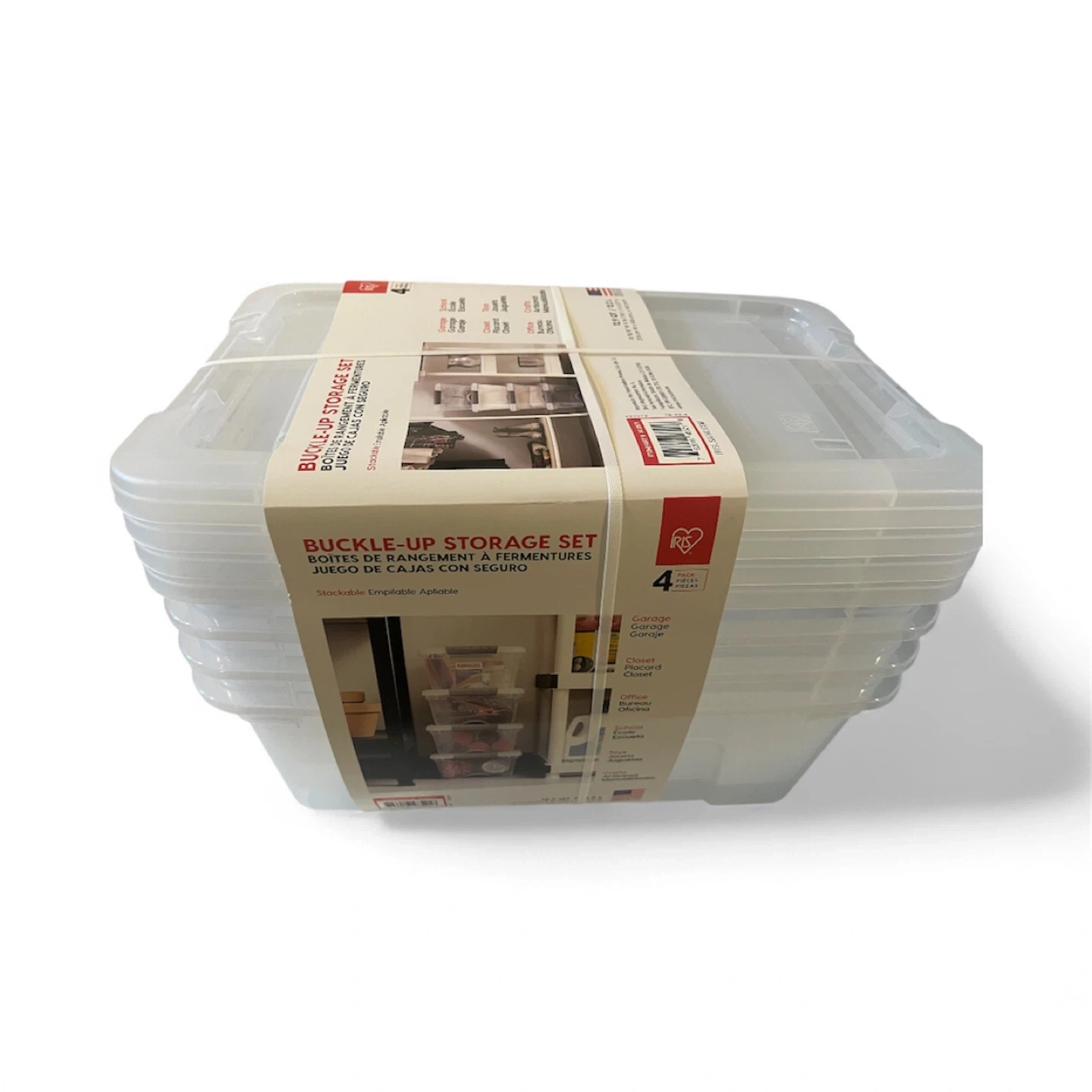 Selling a set of 4 Buckle-Up storage containers! These are stackable and great for organizing your garage, closet, or office