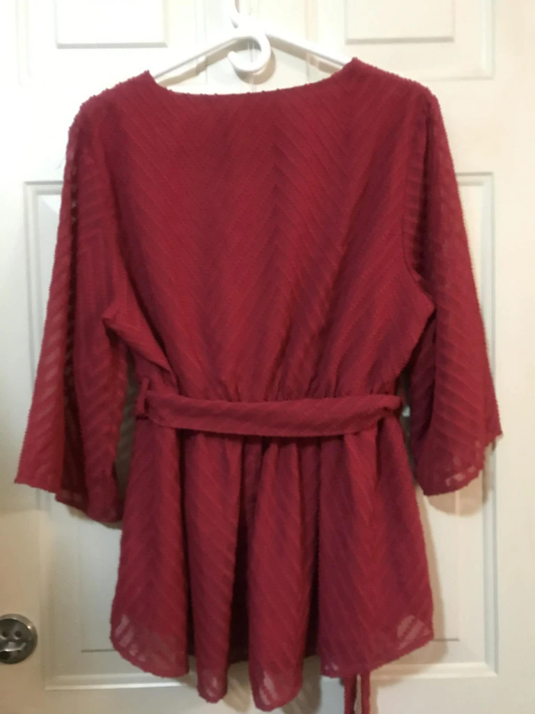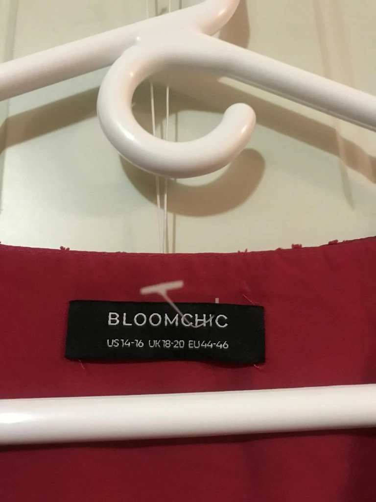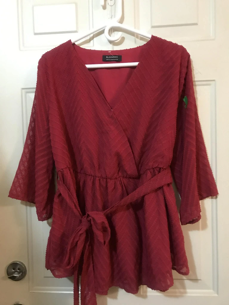This is a Bloomchic red wrap blouse. The size is US 14-16, UK 18-20, and EU 44-46. It's in great condition and ready for a new home!
