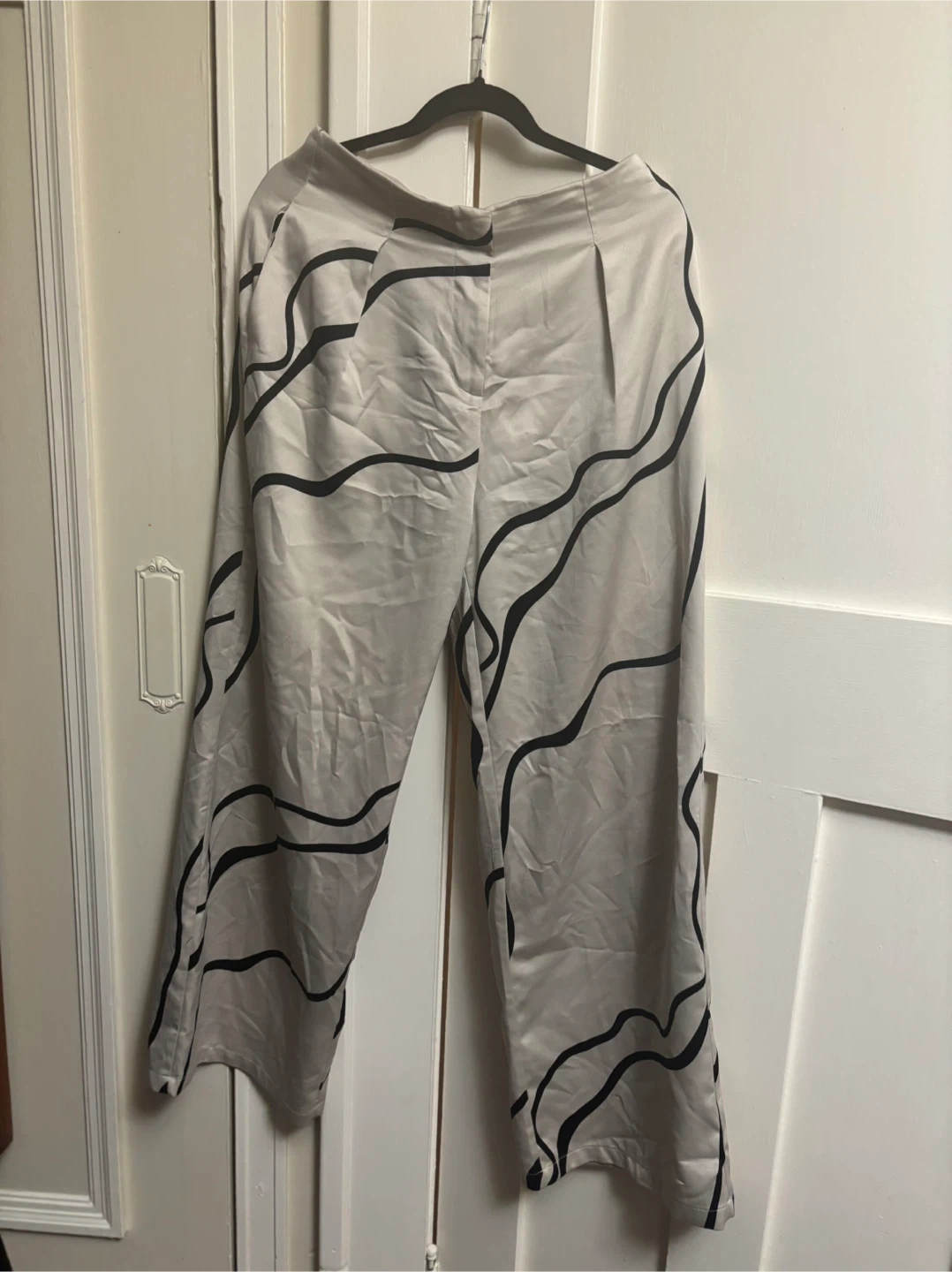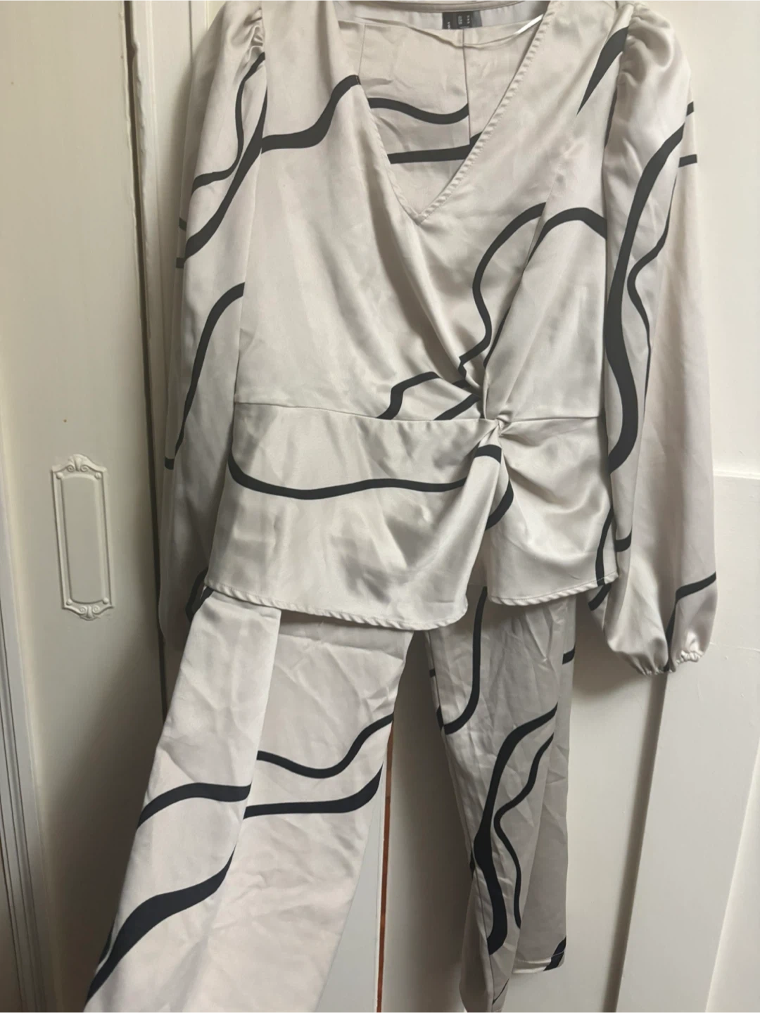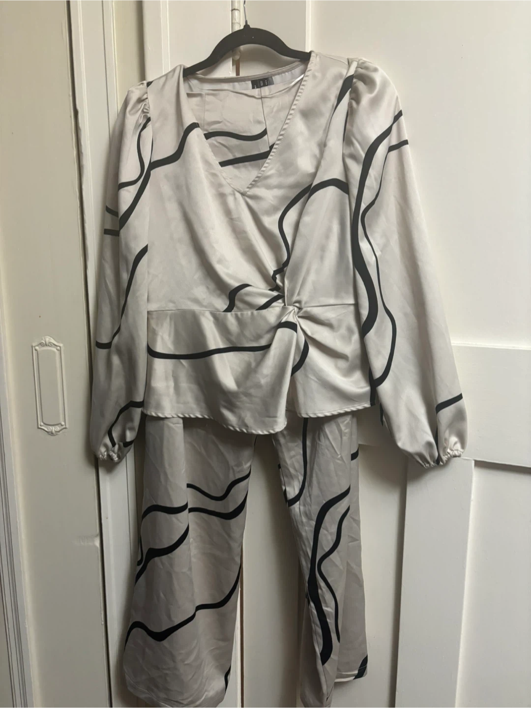 RW&CO matching set in size small. The set includes a top and pants. The material is a cream colour with a black wave pattern. The bottom has a little detail