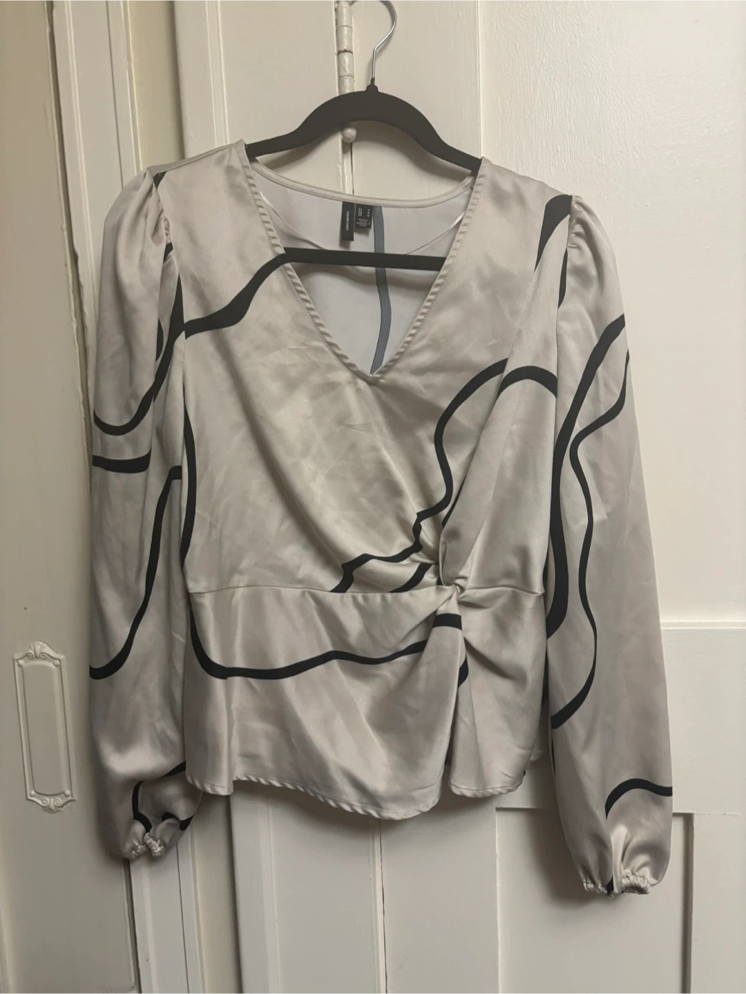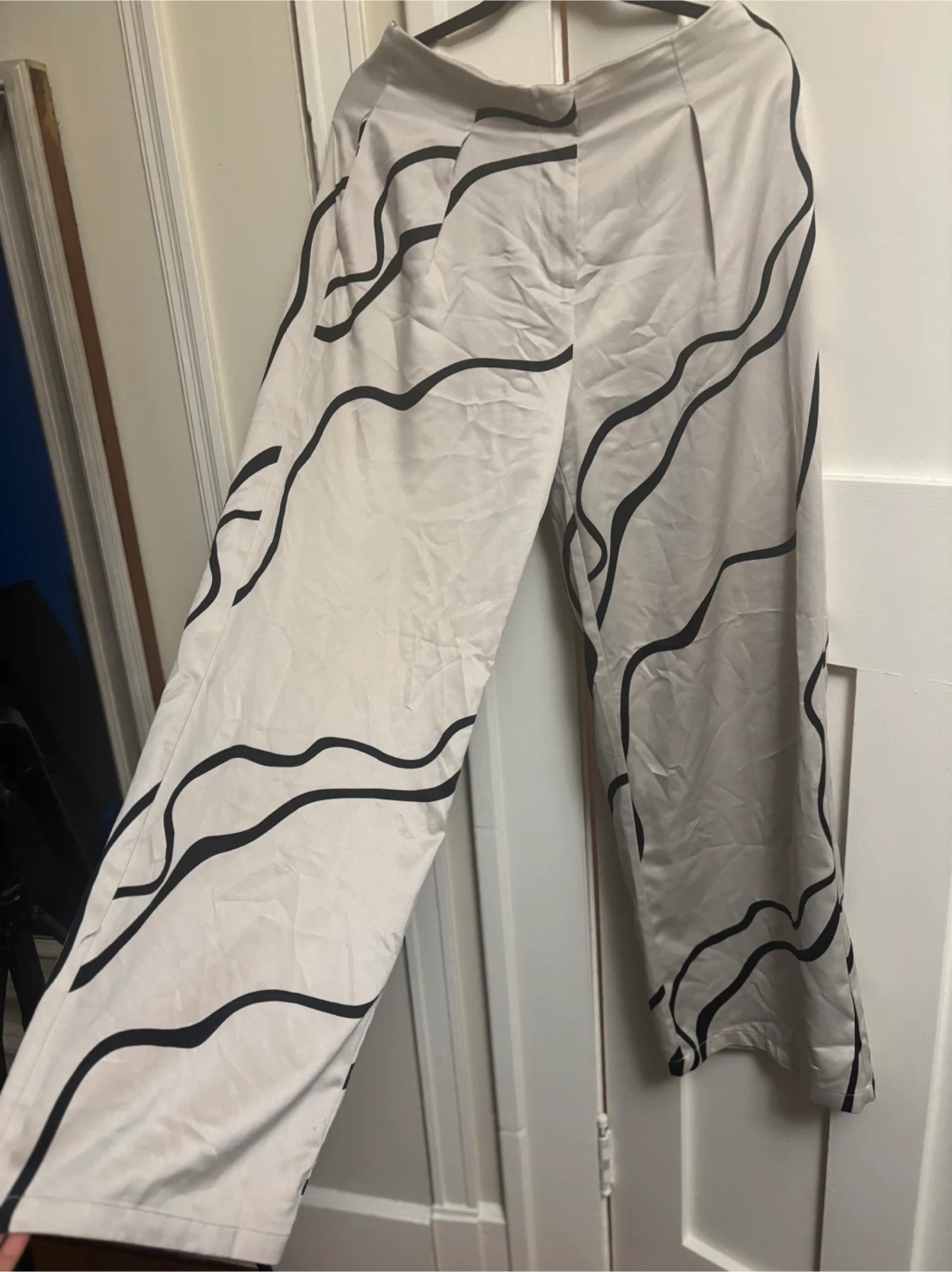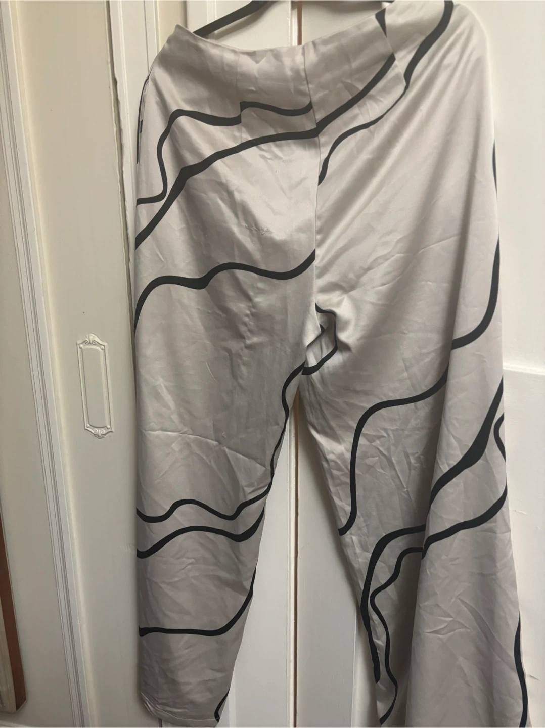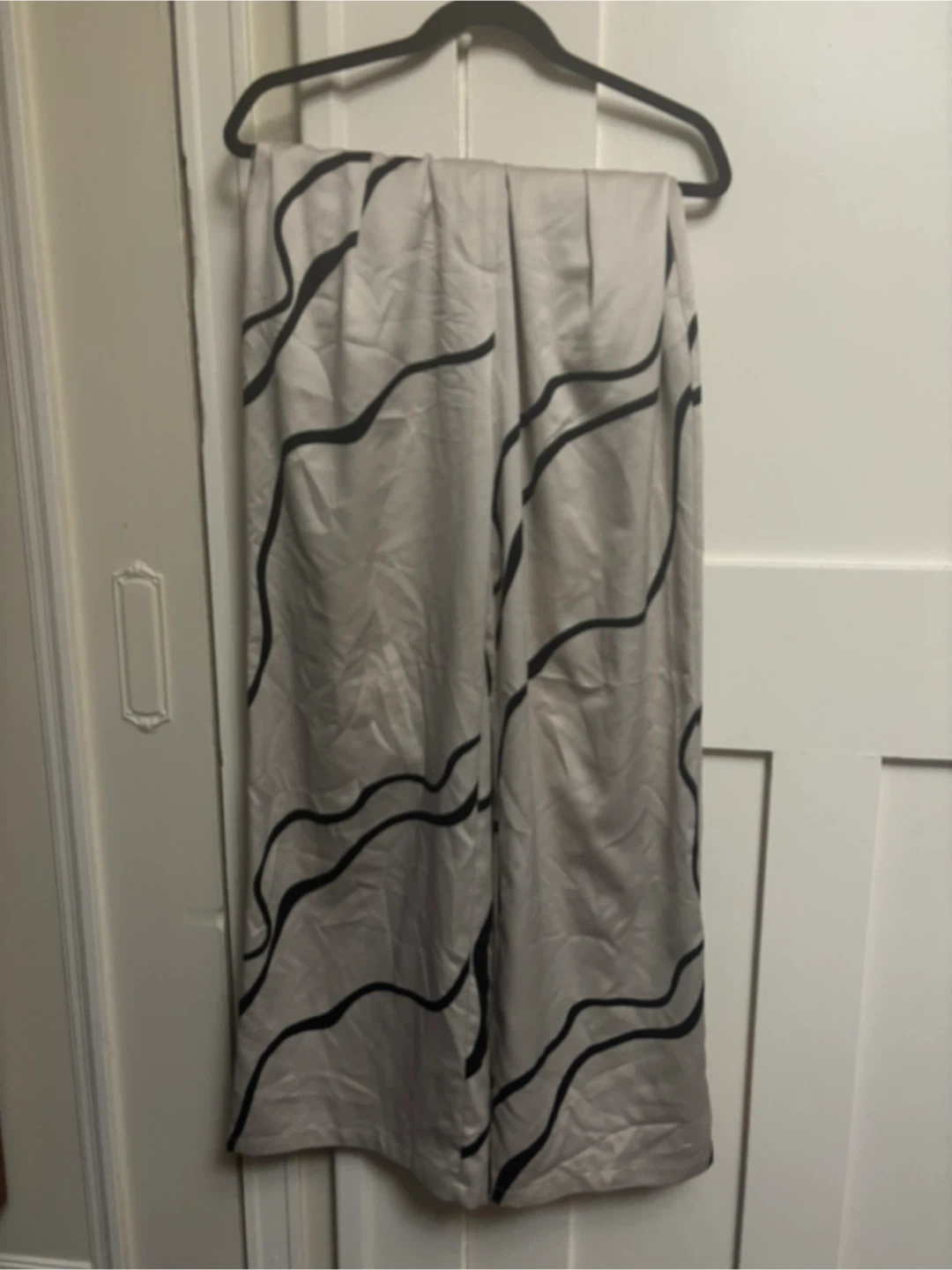 RW&CO matching set in size small. The set includes a top and pants. The material is a cream colour with a black wave pattern. The bottom has a little detail