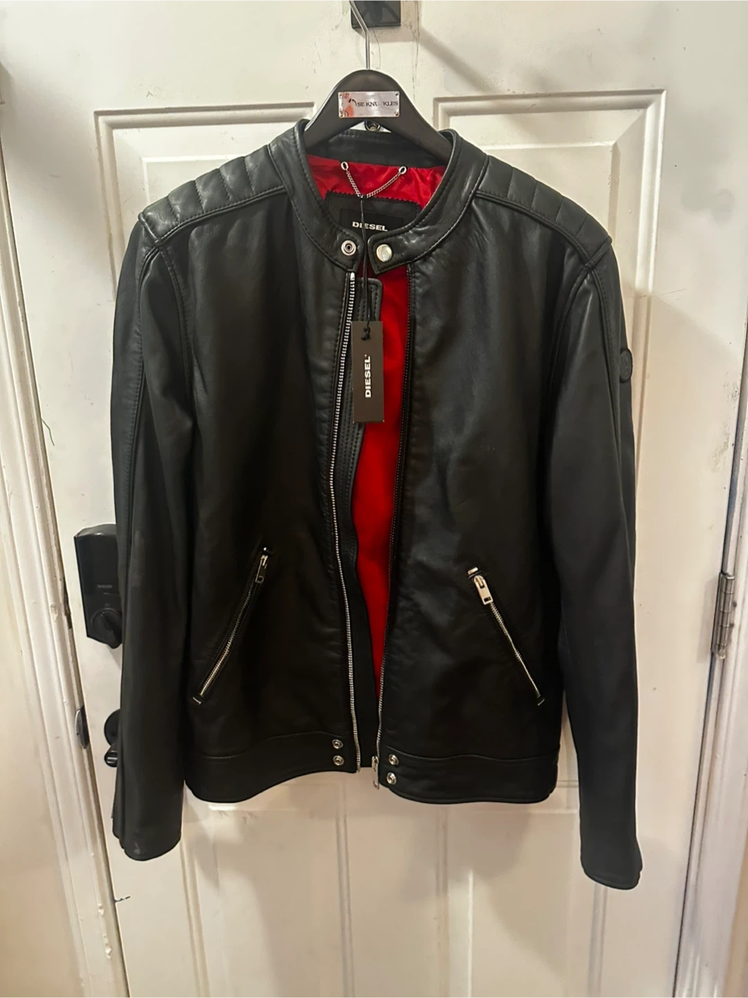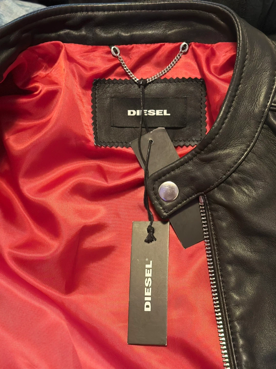 Brand New never worn with tags still attached 🔥Selling a Diesel black leather jacket. It's in great condition and ready to wear. The jacket features a stylish design with a red lining, adding a pop of colour. This is really a great jacket.