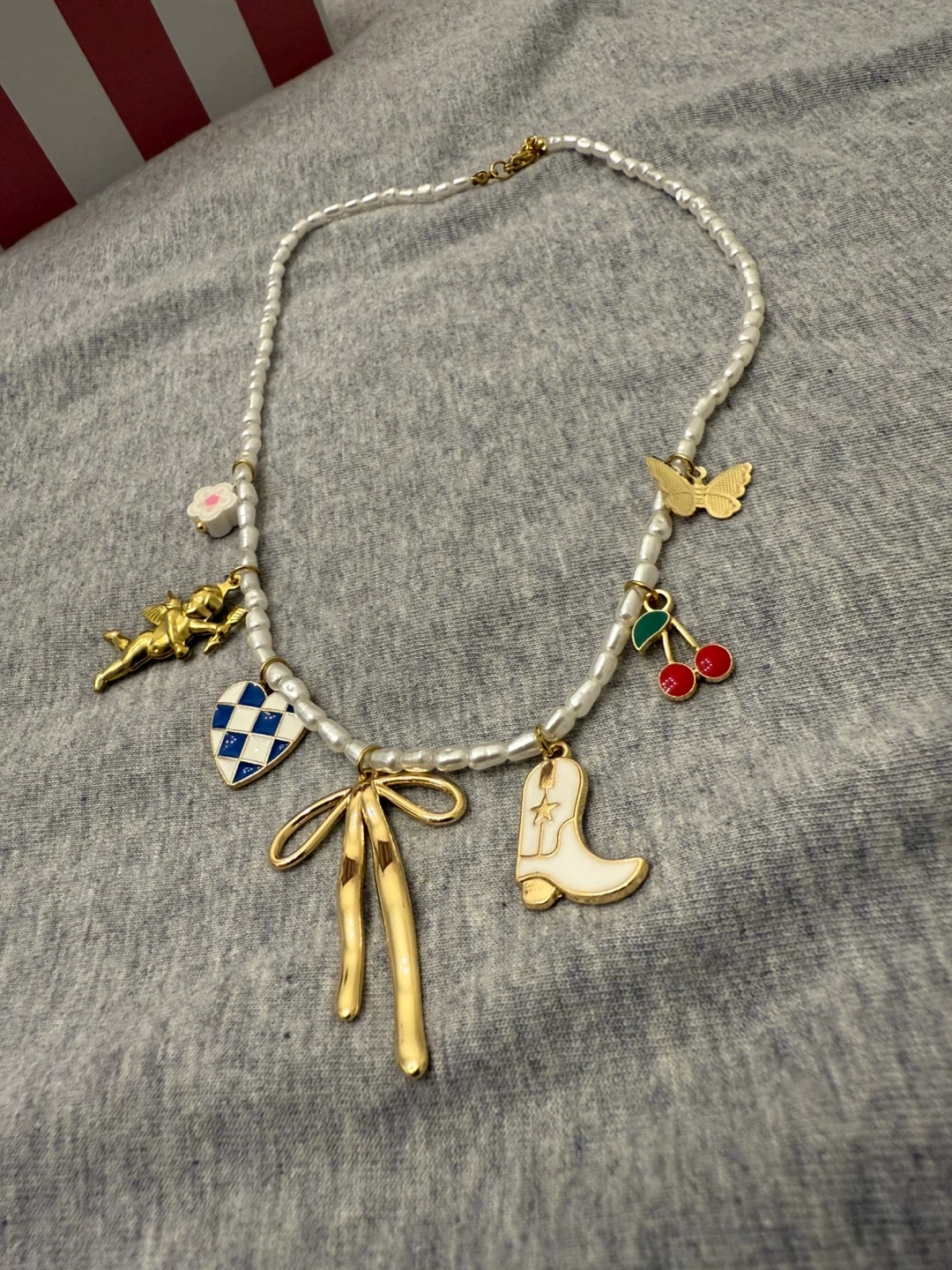 Cute pearl necklace with a variety of charms! It features a mix of gold and colourful accents. The charms include a bow, cherries, a heart, and a cowboy boot. Perfect for adding a touch of whimsy to any outfit!