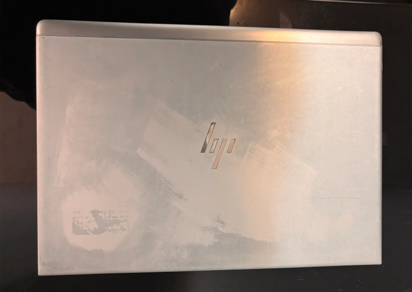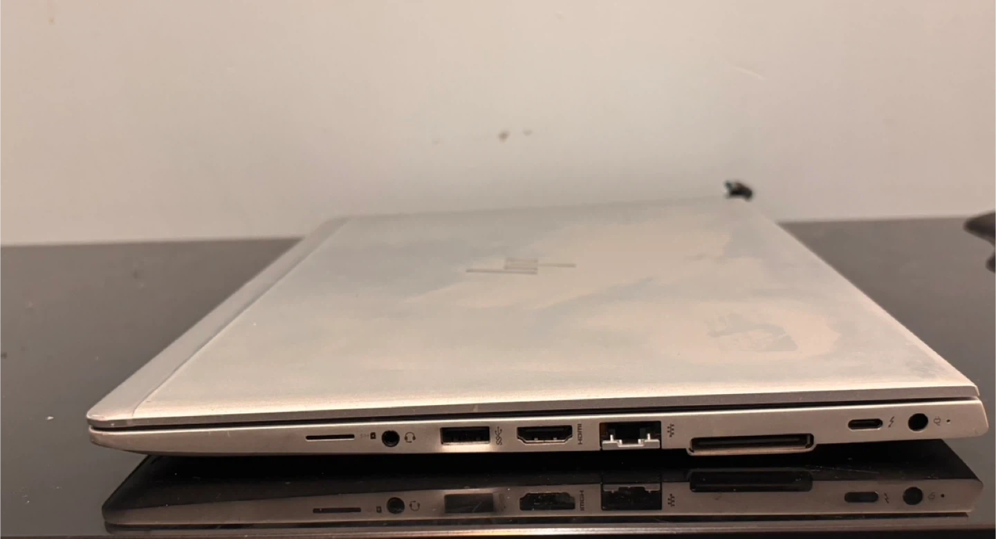 Selling a used HP EliteBook laptop in silver. It comes with its charger. There are some signs of wear on the exterior, but it's still a reliable machine for everyday use