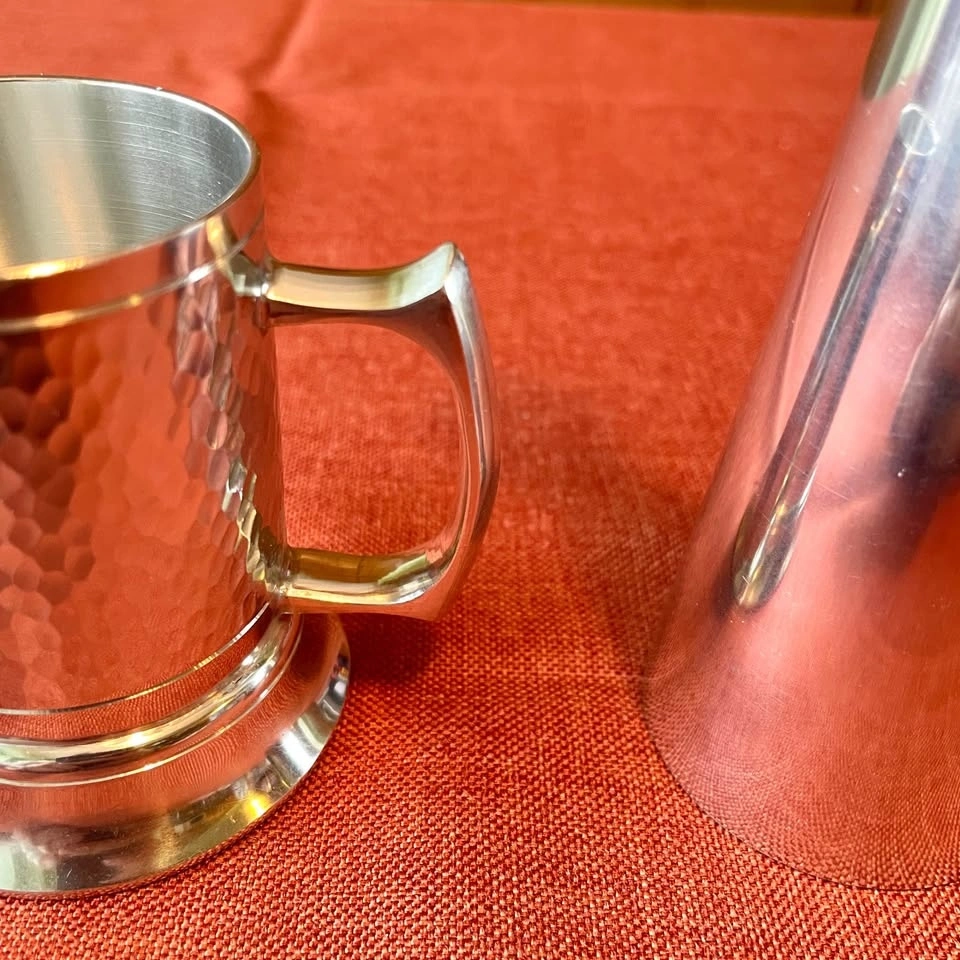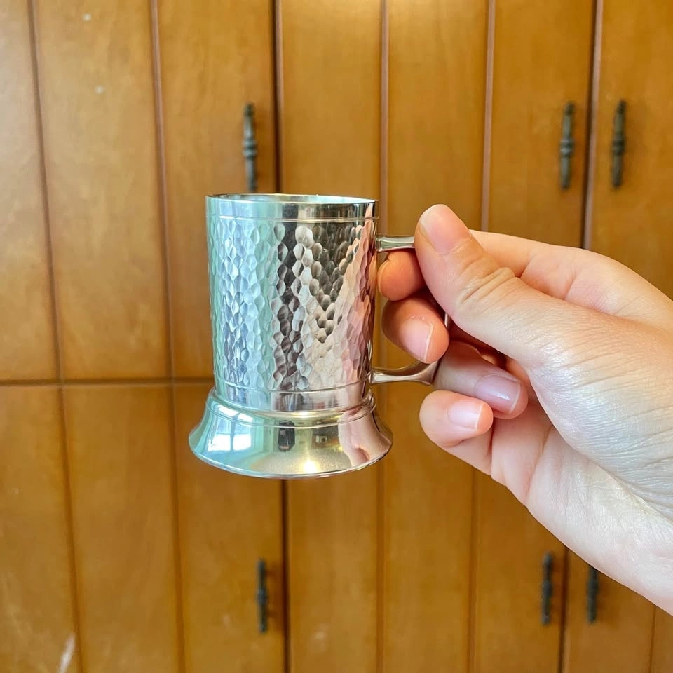 • Small hammered tankard mug with handle – great for espresso, sake, or as decor (approx. 3”)