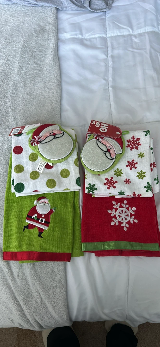 Super cute Christmas kitchen towel set, brand new with tags! Perfect for adding a festive touch to your kitchen this holiday season. The set includes two towels, one green with Santa and polka dots, and one red with snowflakes. They're ready to bring some holiday cheer to your home!