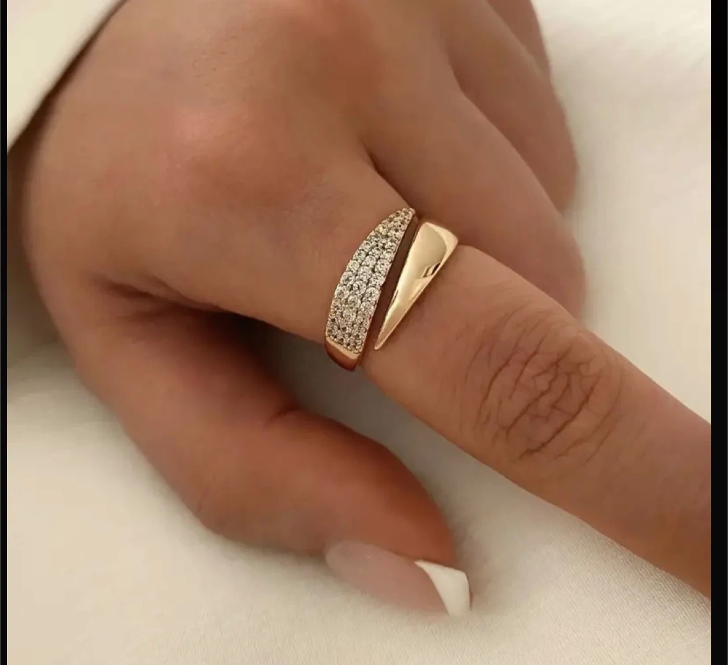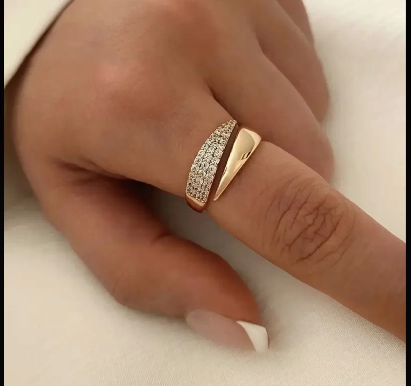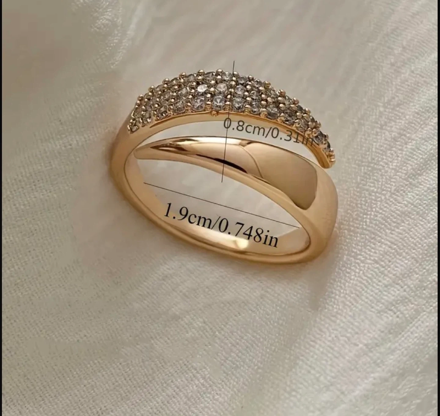 Selling a beautiful gold tone statement ring! It features a unique design with sparkling accents. The ring measures approximately 1.9cm in width and 0.8cm in height. Adjustable Ring