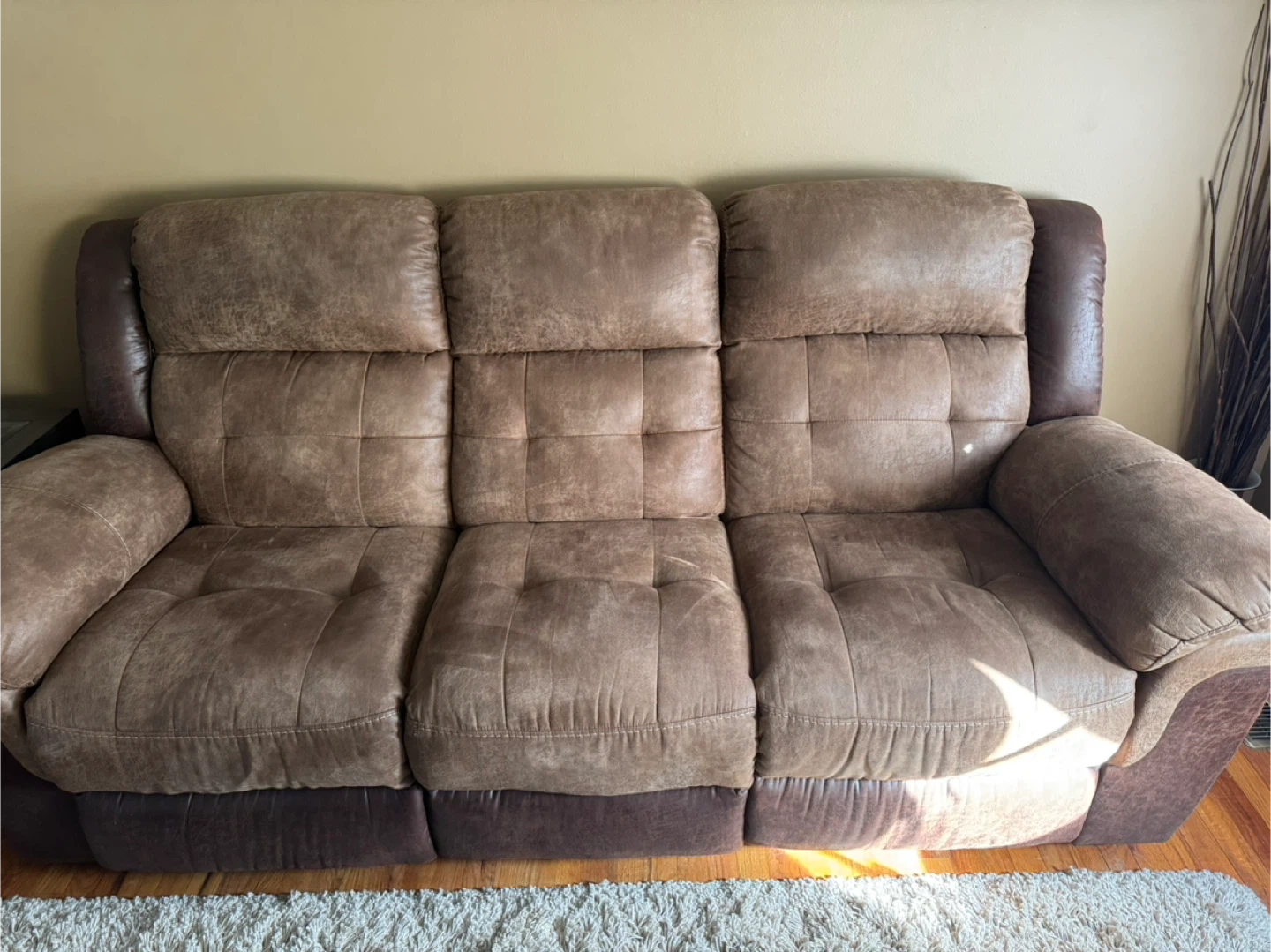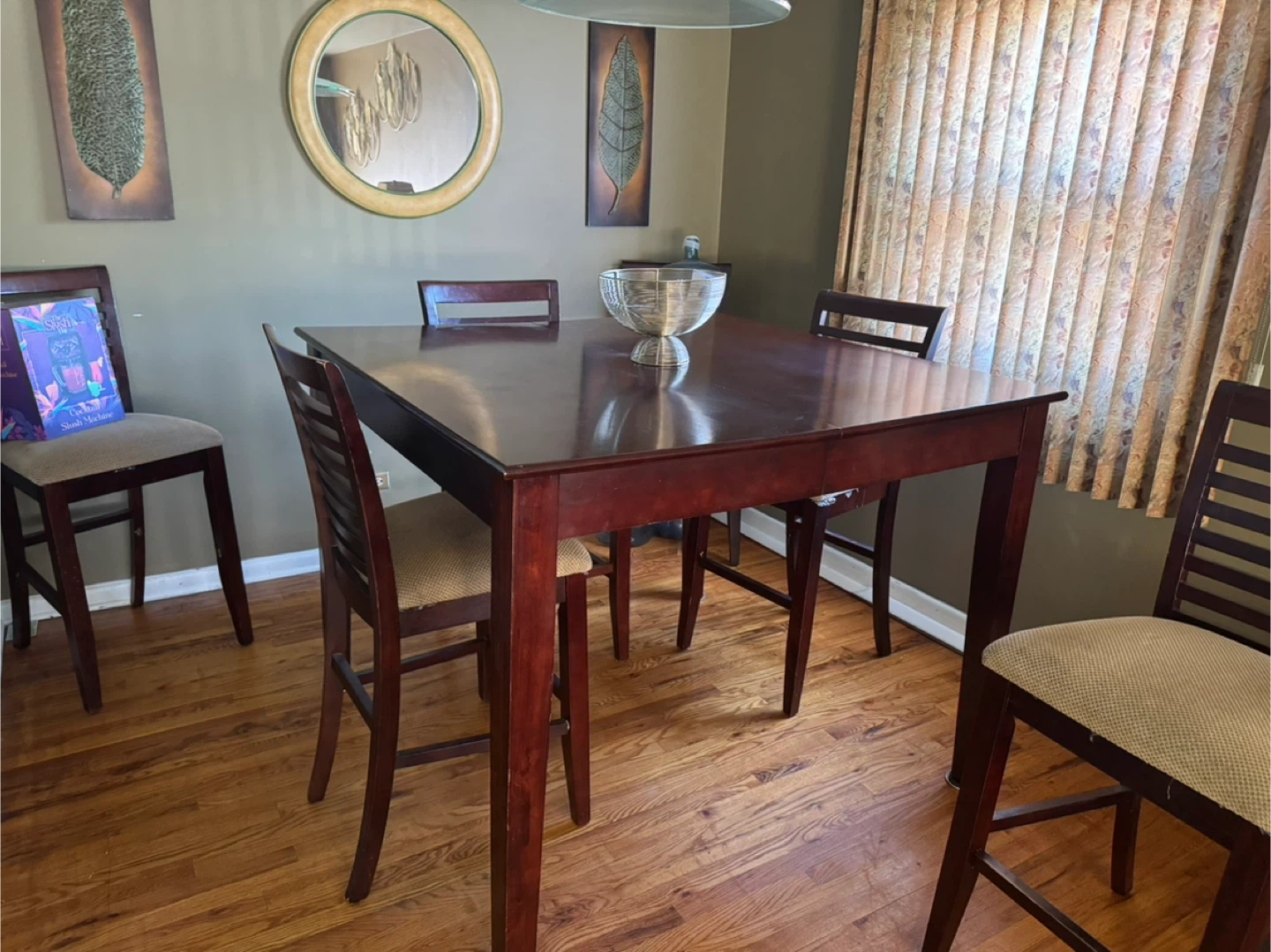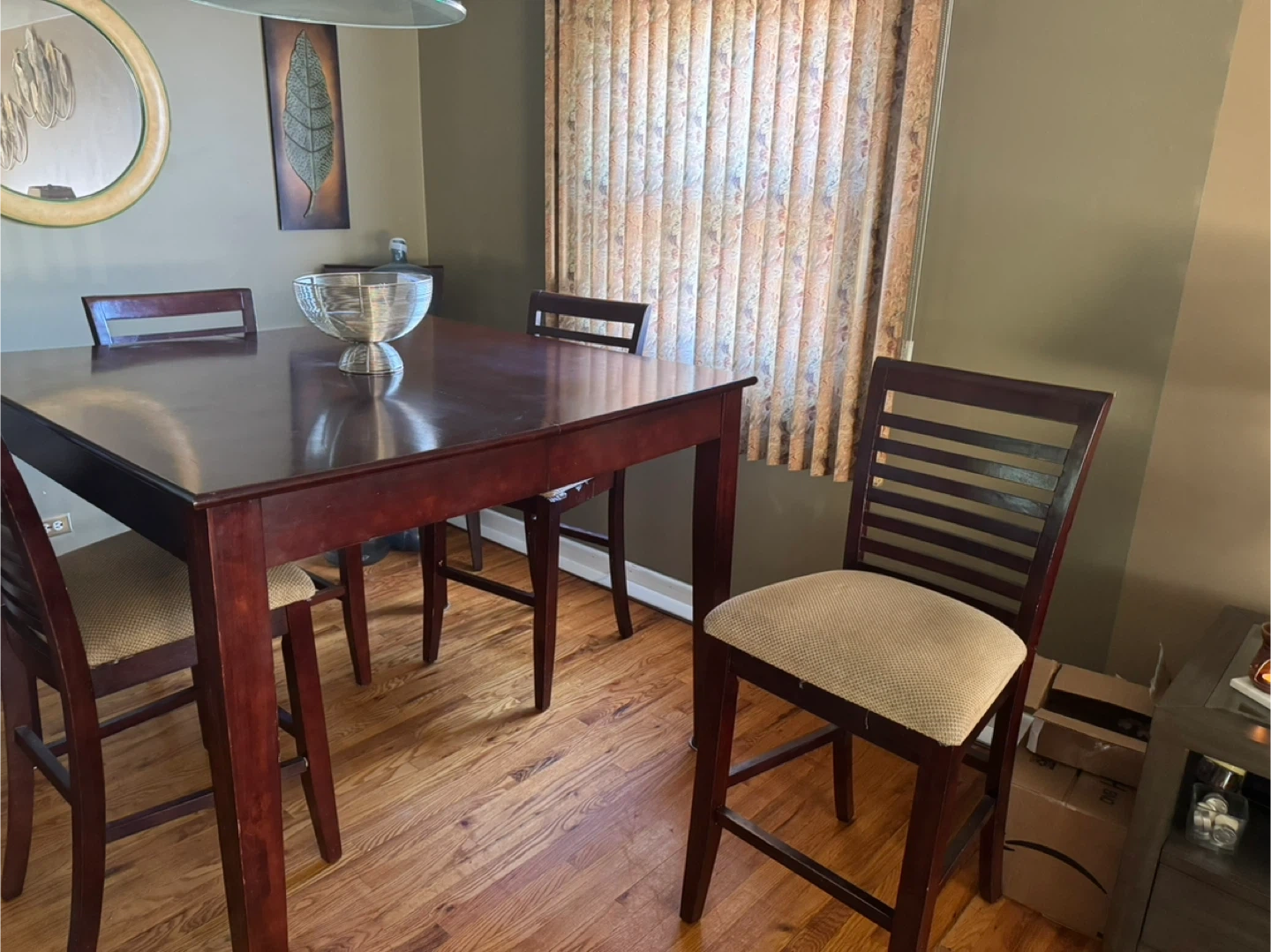 Selling a used dining table with four chairs. It's a sturdy set perfect for a family or small gatherings. The table has a rich, dark finish and the chairs are upholstered with a neutral fabric. There are some signs of use, but overall it's in good condition and ready for a new home