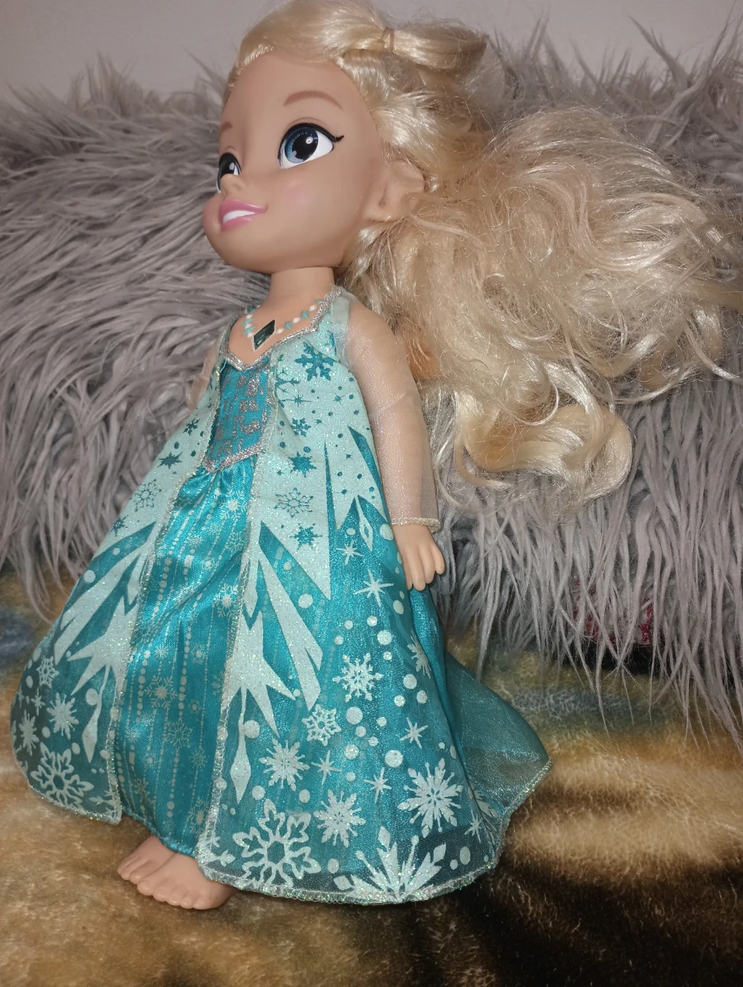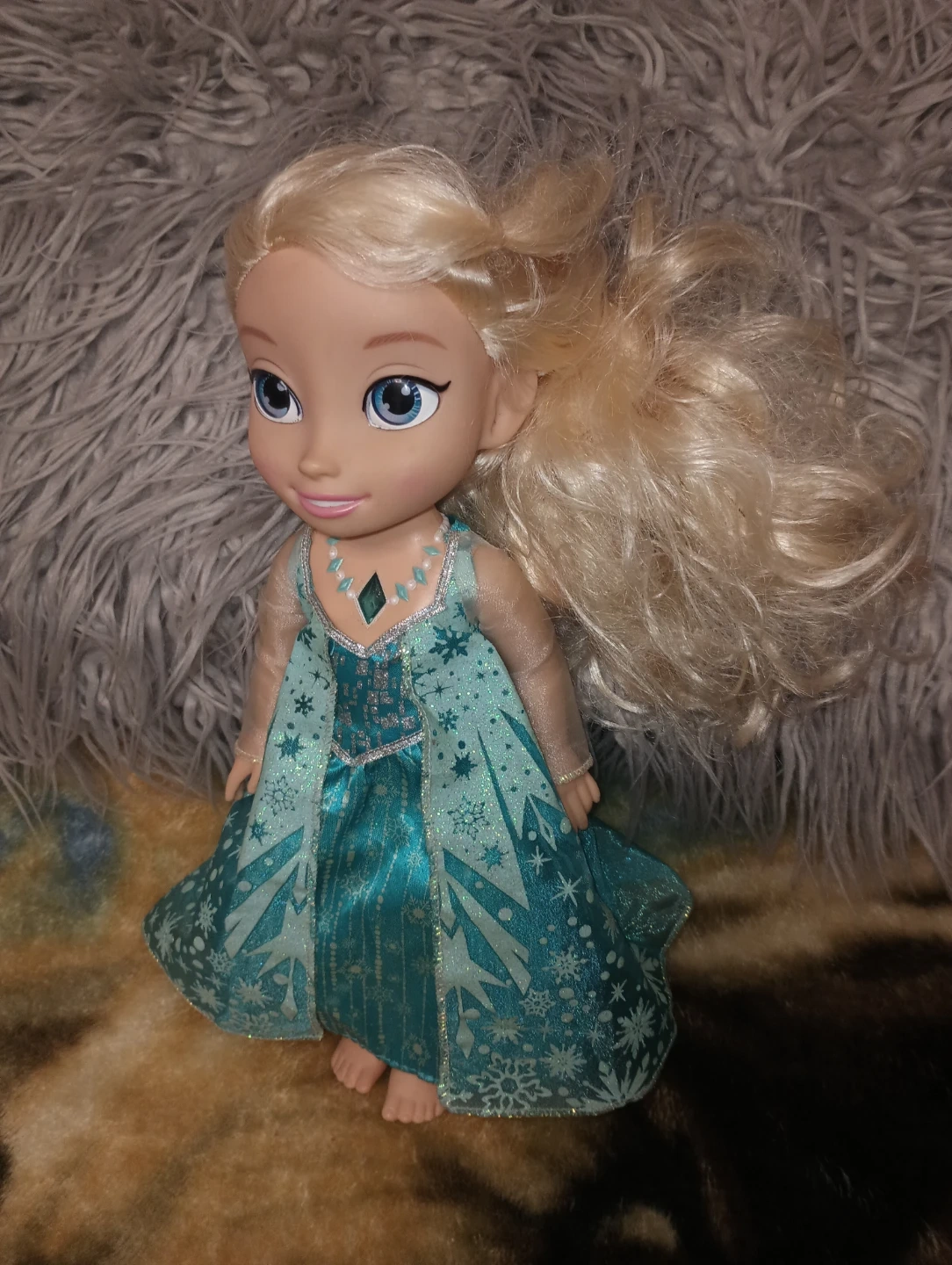 This is a cute Elsa doll from Disney's Frozen! It's in great condition and ready for a new home. She's wearing her signature blue dress with snowflake details and has her iconic blonde hair. Perfect for any Frozen fan!