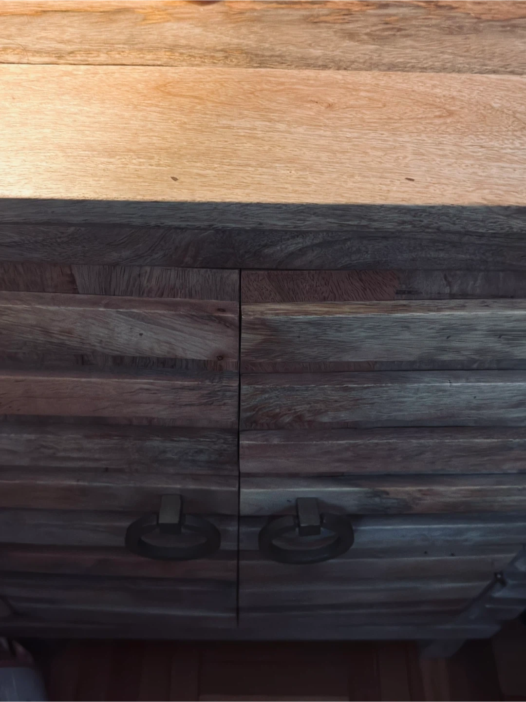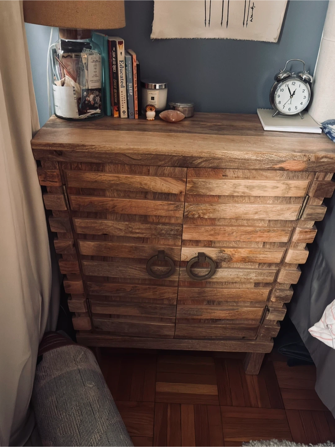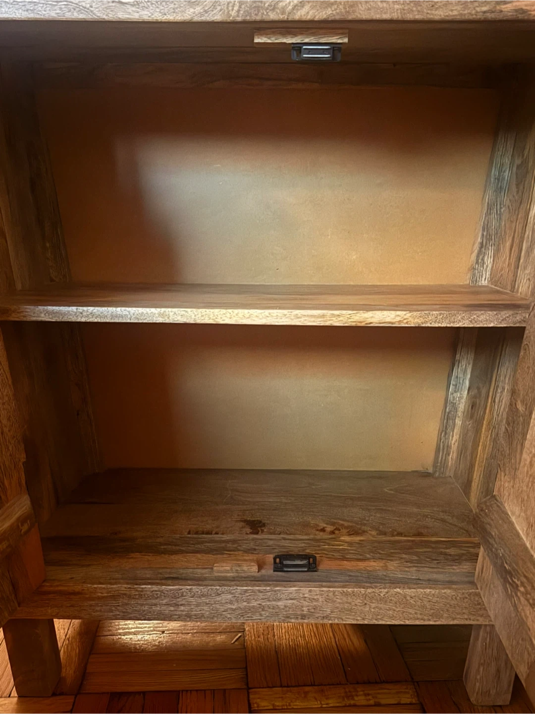 This is a beautiful mango wood cabinet with doors that would be perfect for a bedroom or living room! It has a natural wood finish and a unique design. It's in great condition and ready for a new home. One shelf on the inside.
