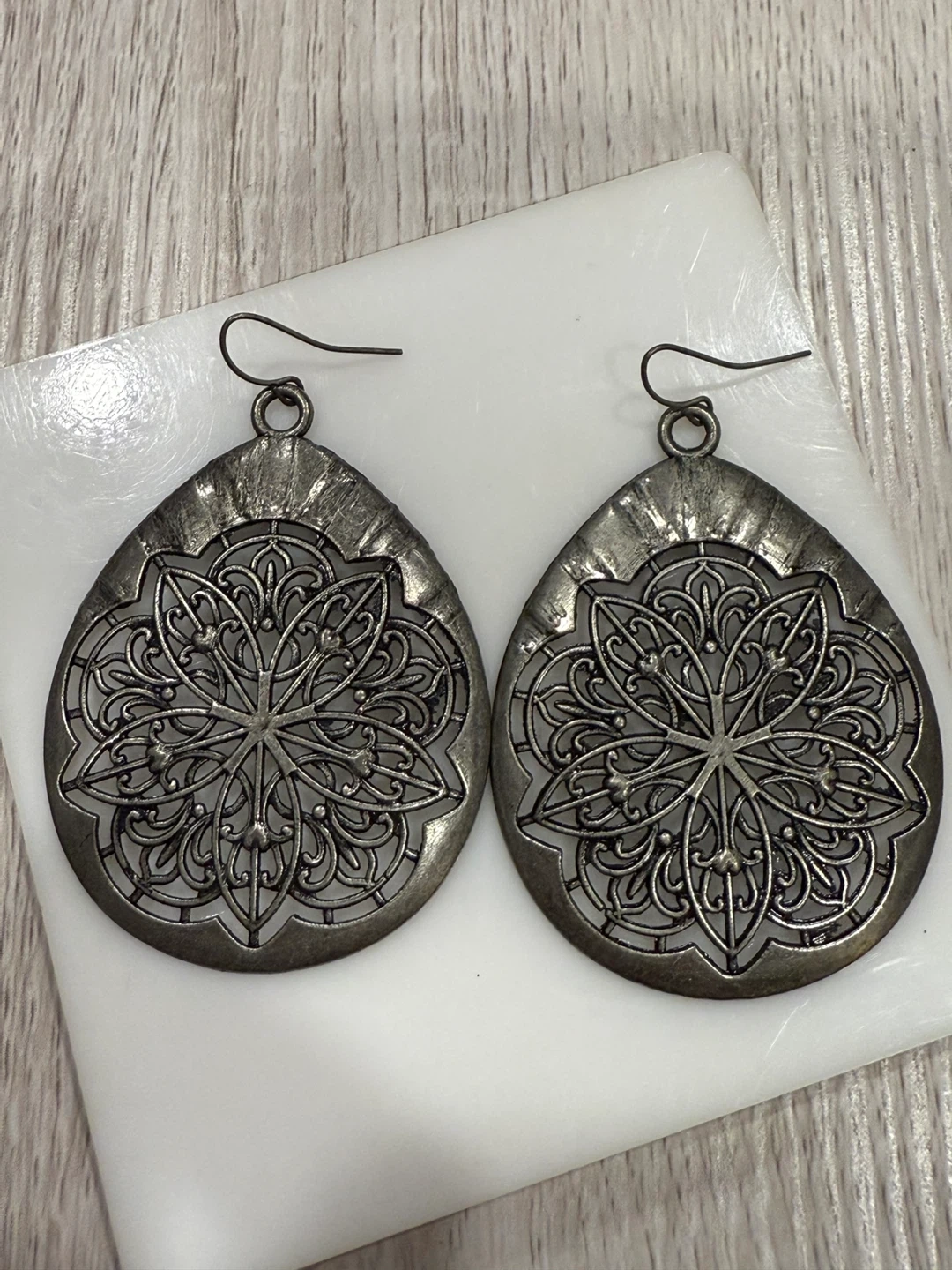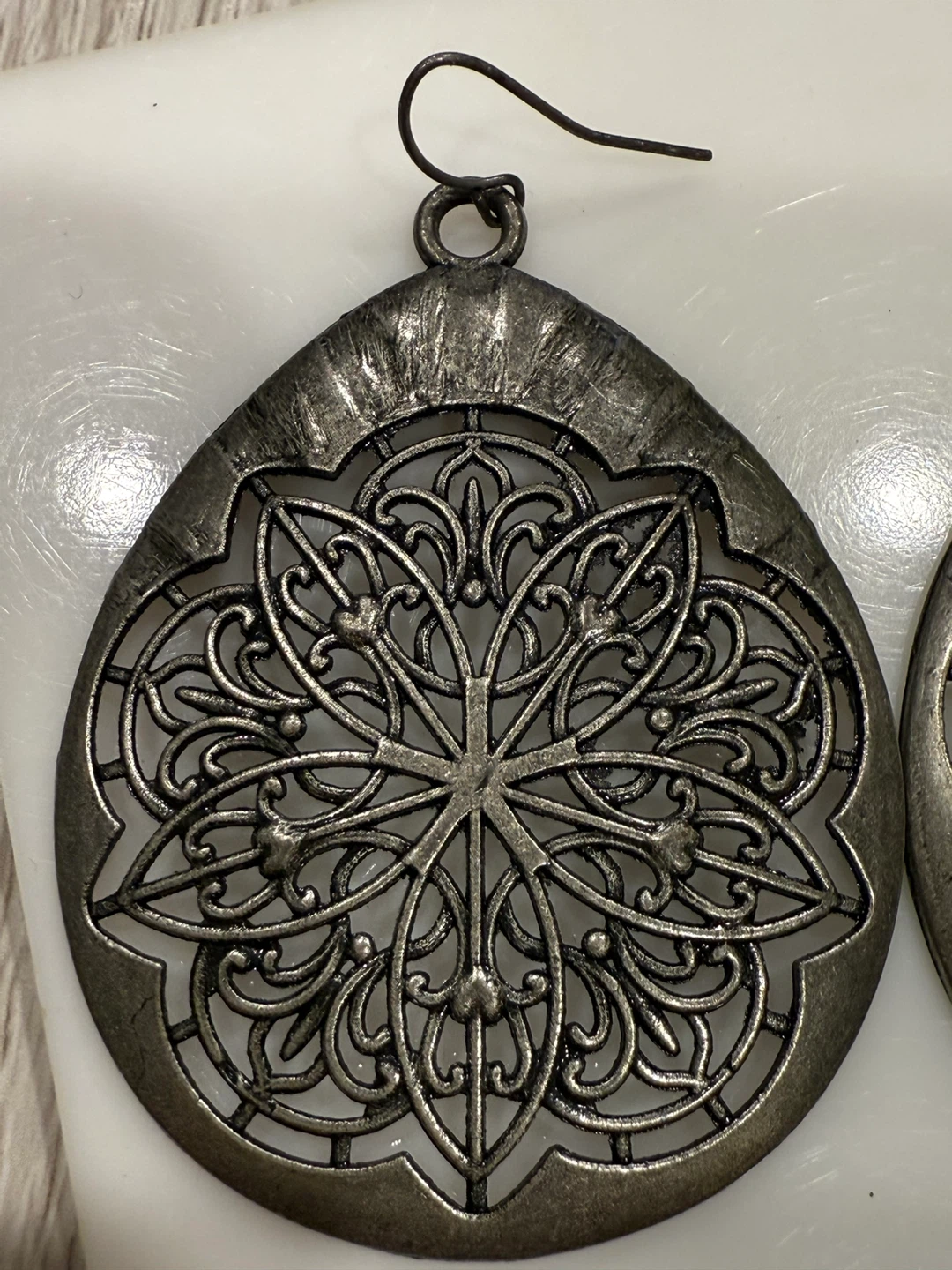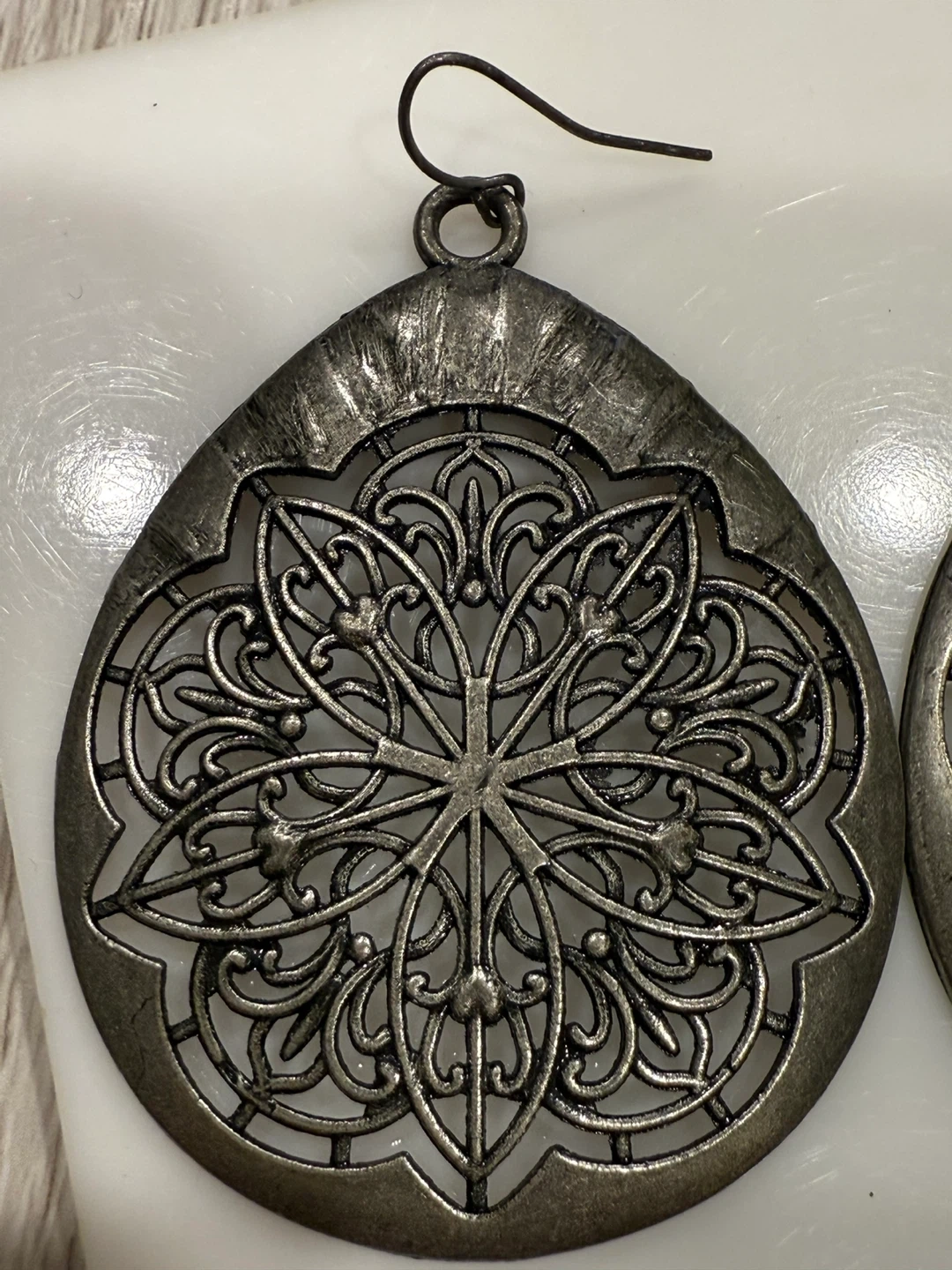 These are a pair of silver-tone teardrop dangle earrings with a filigree design. They're perfect for adding a touch of elegance to any outfit!