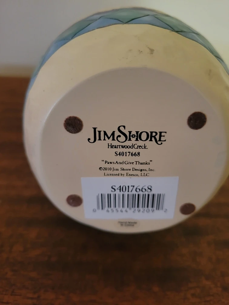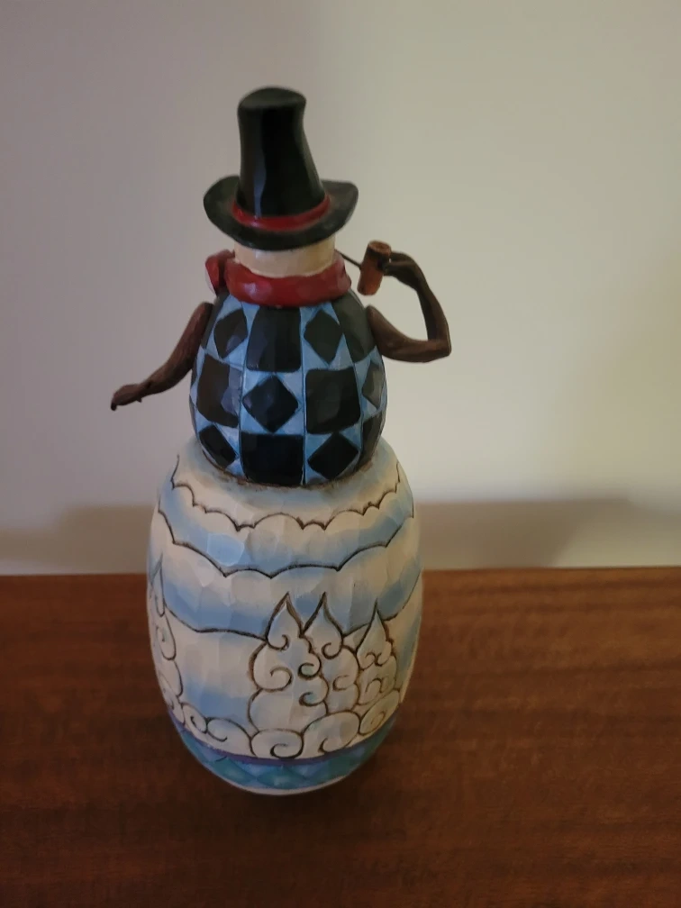 Selling a Jim Shore Heartwood Creek figurine. It's a charming snowman design titled "Paws And Give Thanks" with the model number S4017668. This piece is licensed by Enesco, LLC and has a unique hand-made feel