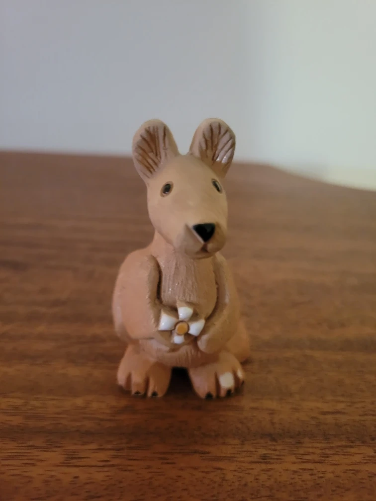 This is a vintage Artesania Rinconada stoneware kangaroo figurine holding a flower.