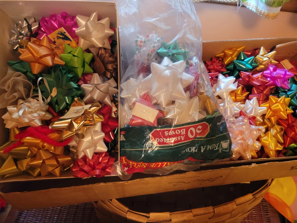 Selling a large collection of assorted gift bows! There are a variety of colors and sizes, perfect for all your gift-wrapping needs. They come in two boxes and a bag. Great for the holidays or any special occasion
