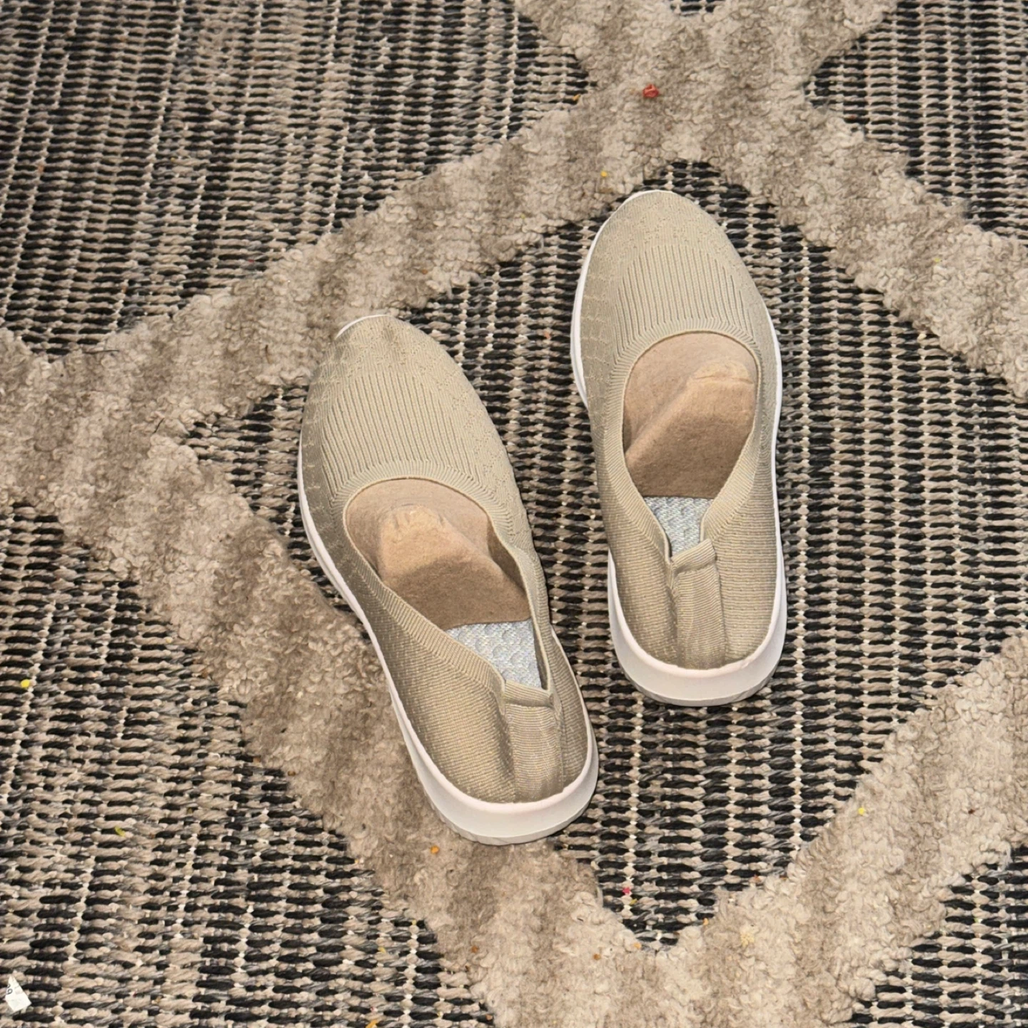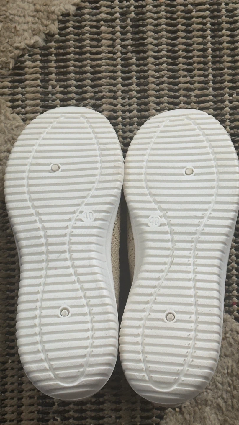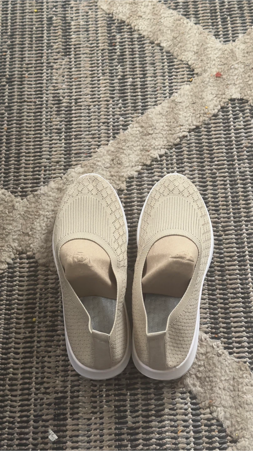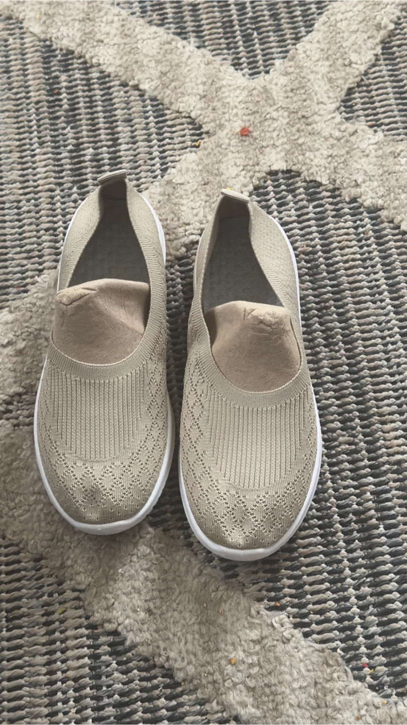Selling a pair of comfortable beige slip-on shoes. They are in good condition and ready for a new home