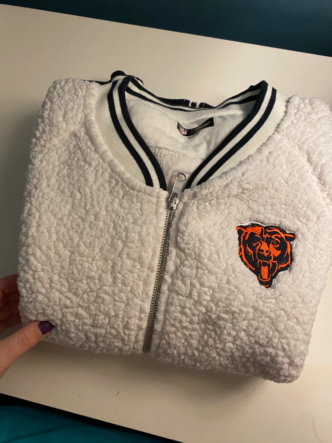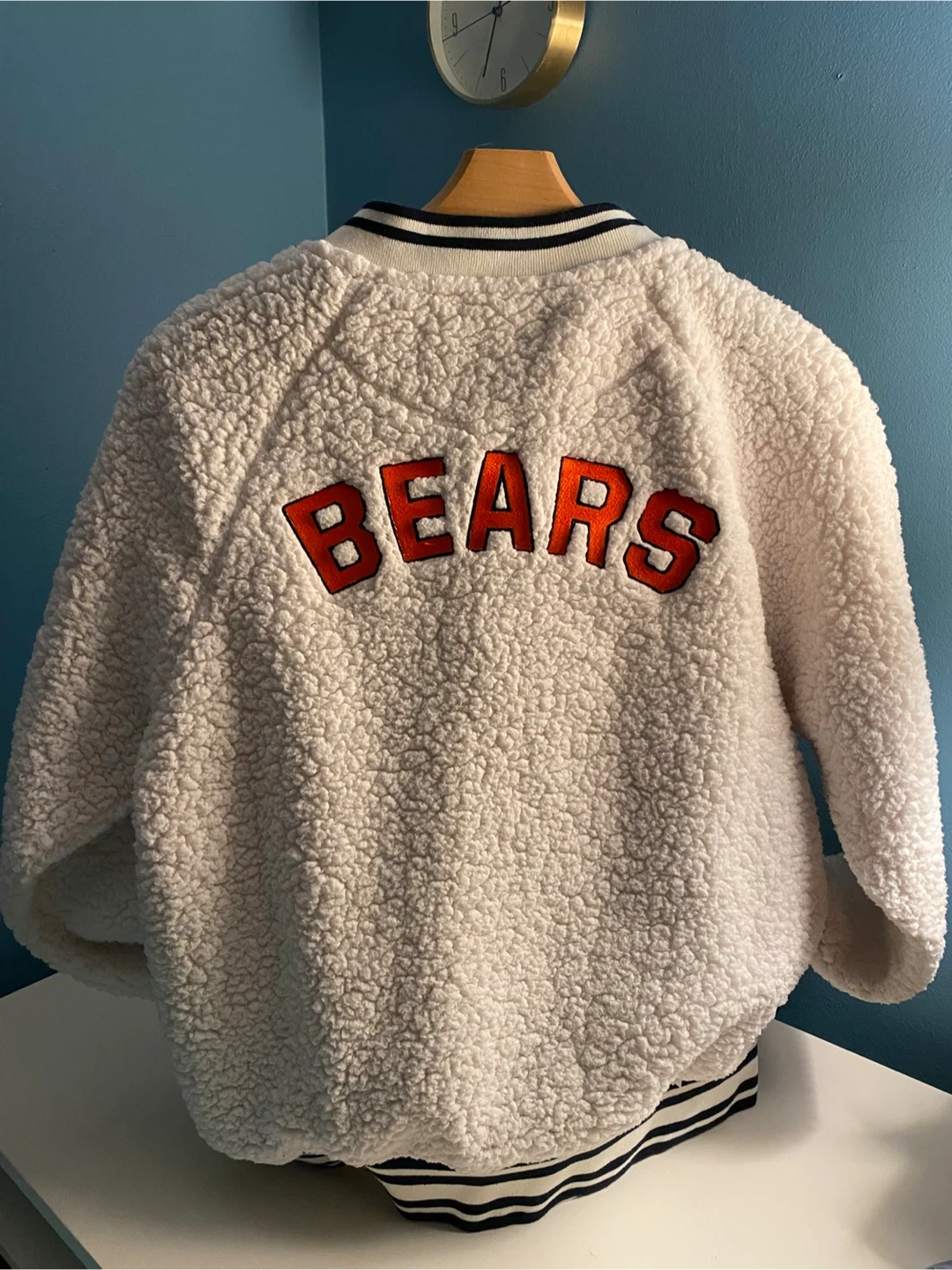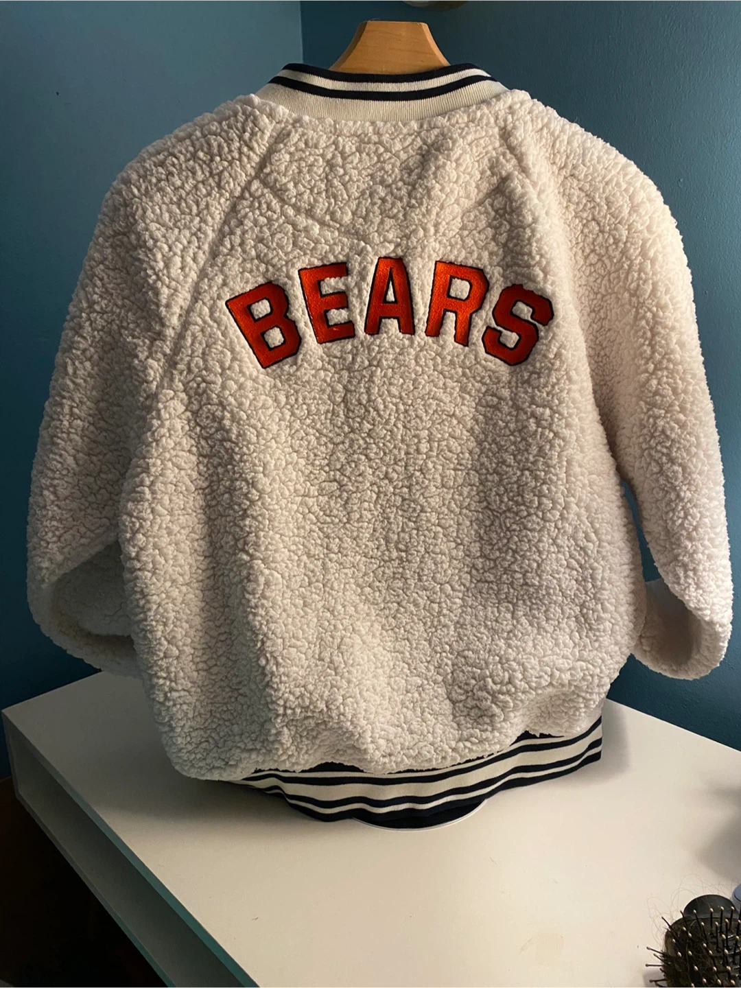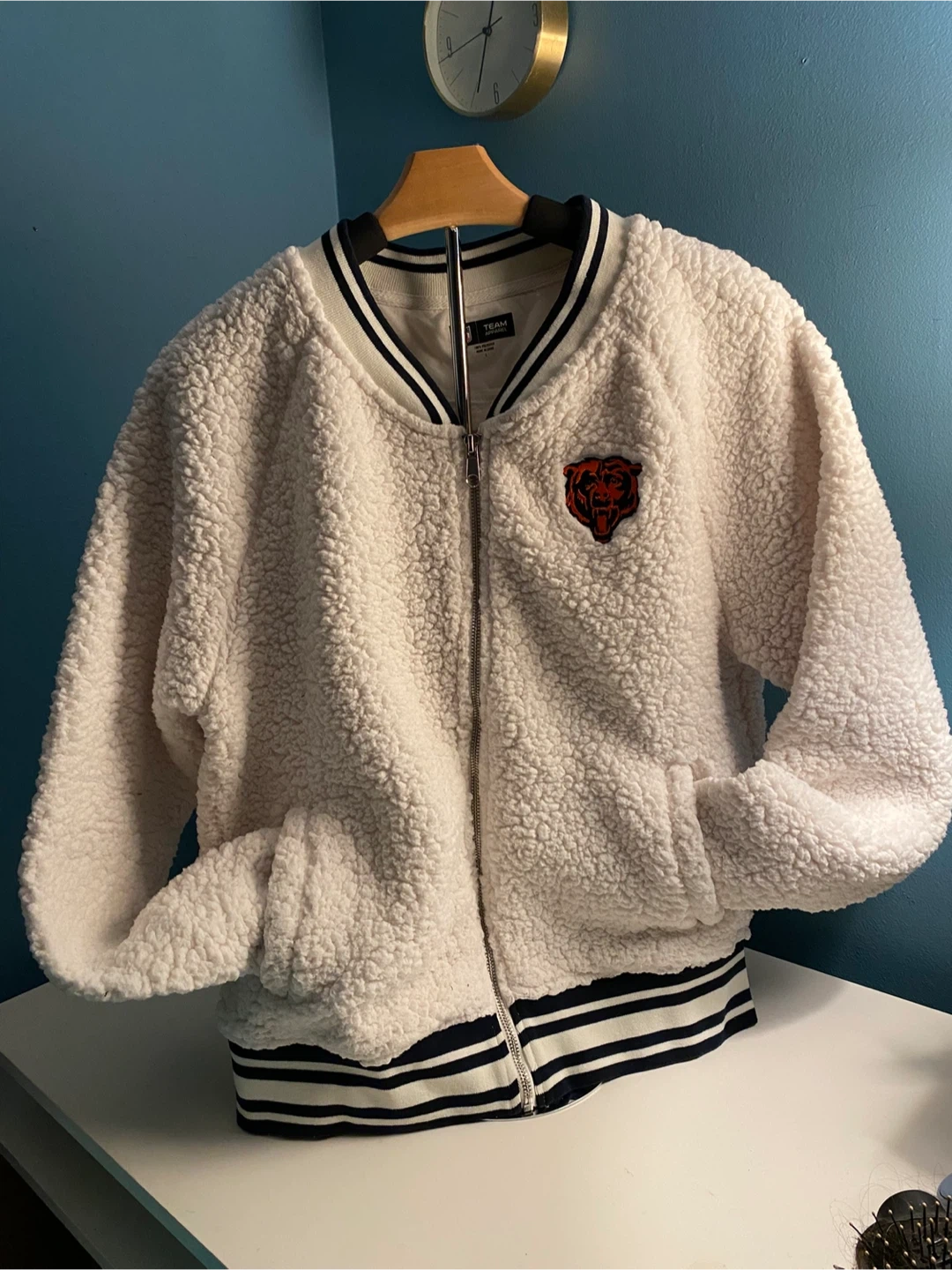 Cozy up in this Chicago Bears sherpa bomber jacket! It's a super soft and warm jacket, perfect for showing your team spirit. The jacket features the Bears logo and colors. Great for game days or just staying comfortable!