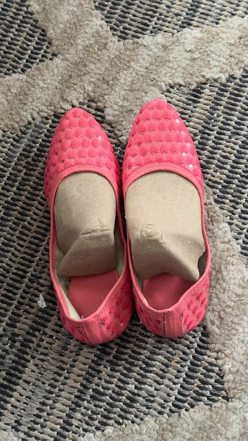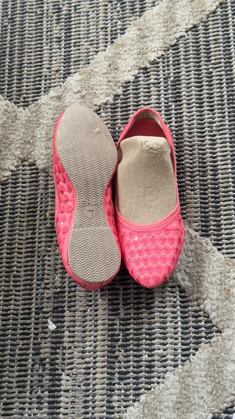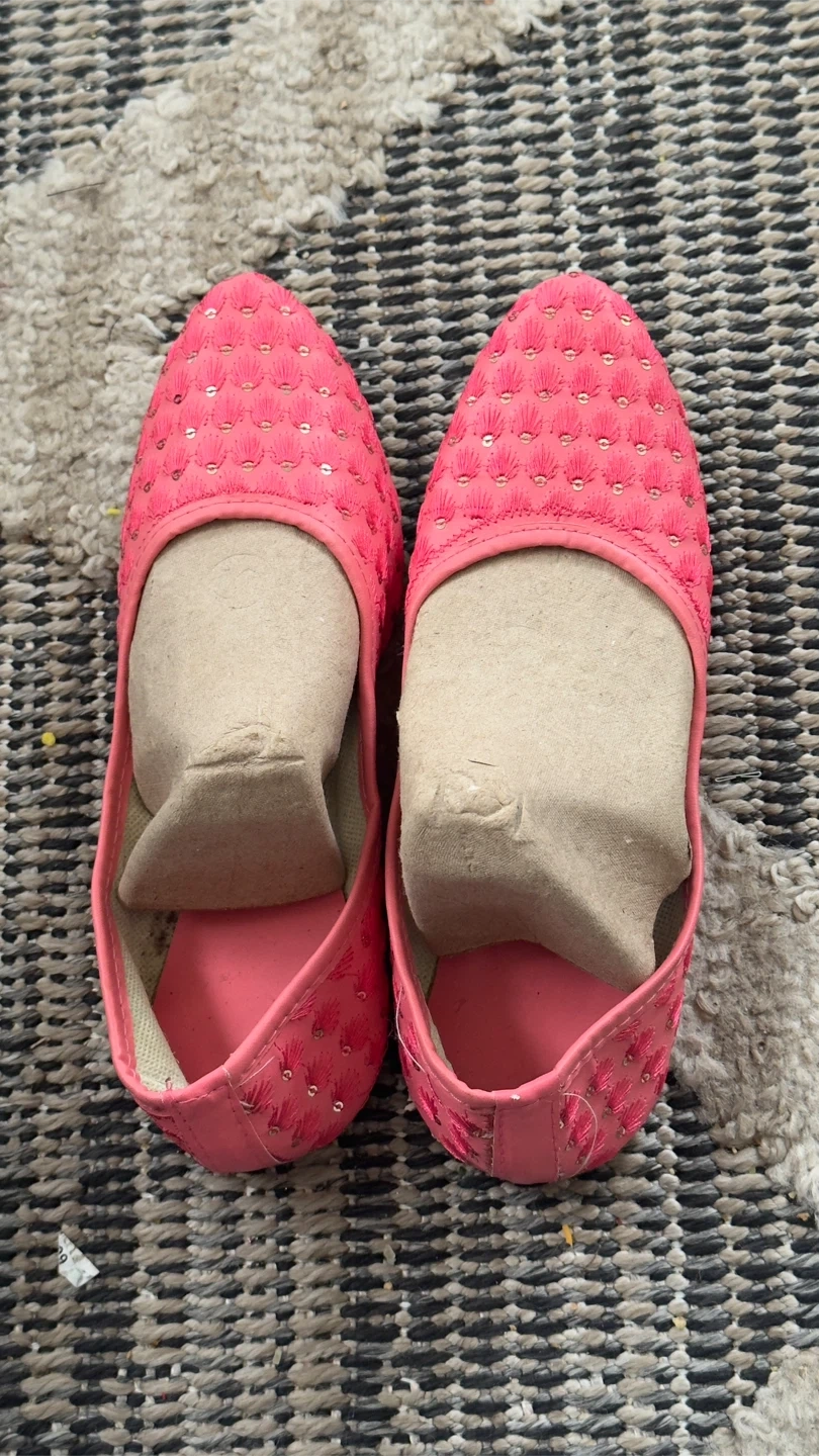 These are a pair of pink Indian Jutti shoes with beautiful embroidery. They appear to be in good condition and are a size 7. Perfect for adding a pop of color to your outfit!