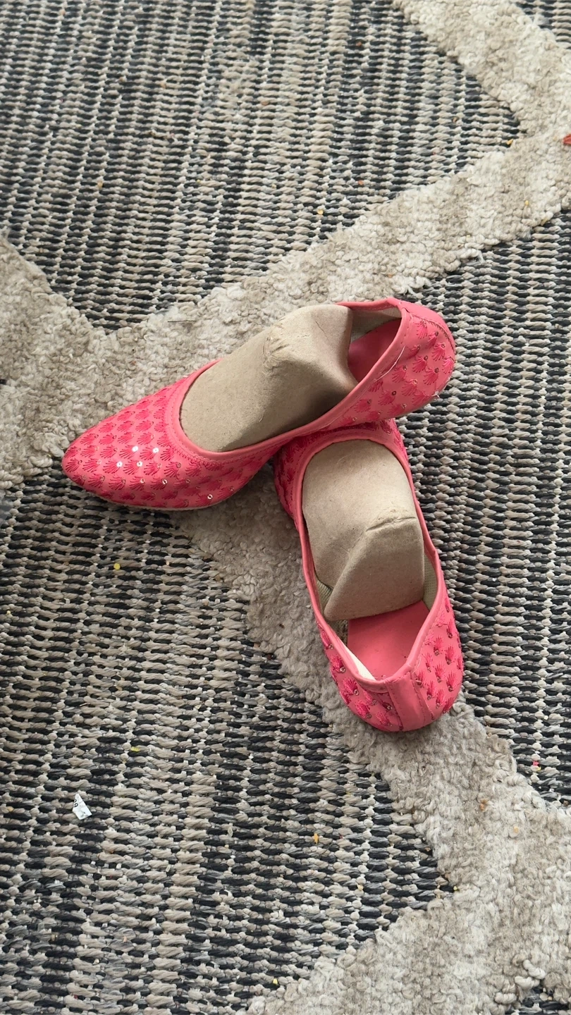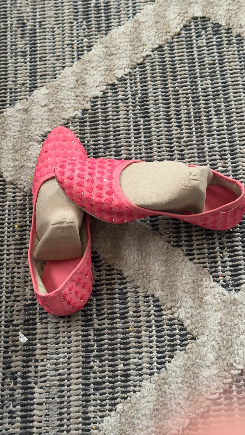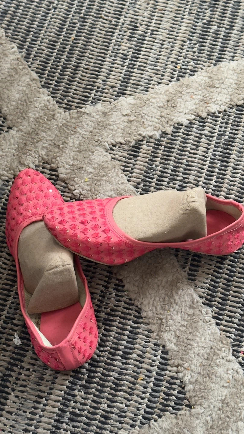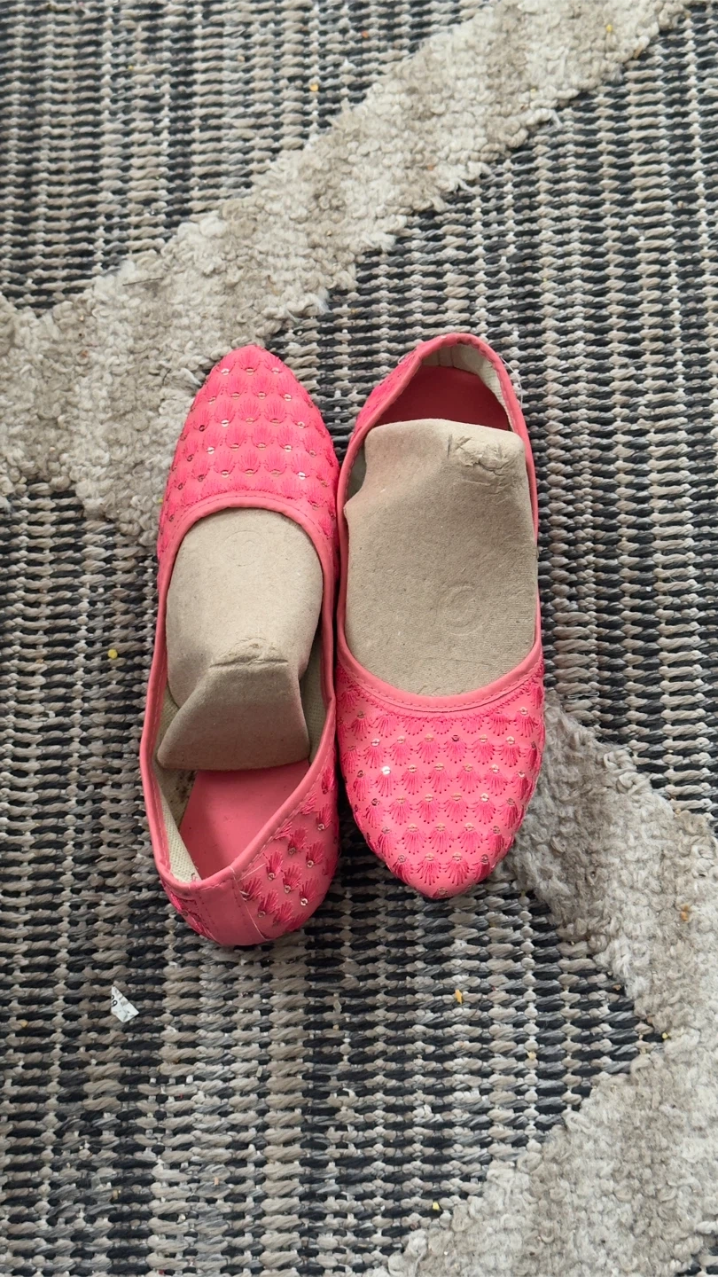 These are a pair of pink Indian Jutti shoes with beautiful embroidery. They appear to be in good condition and are a size 7. Perfect for adding a pop of color to your outfit!