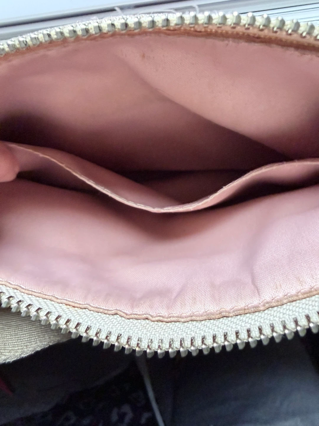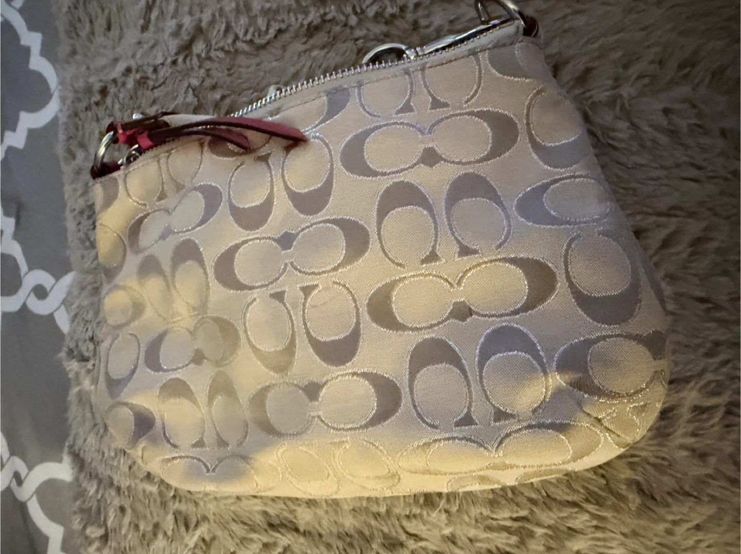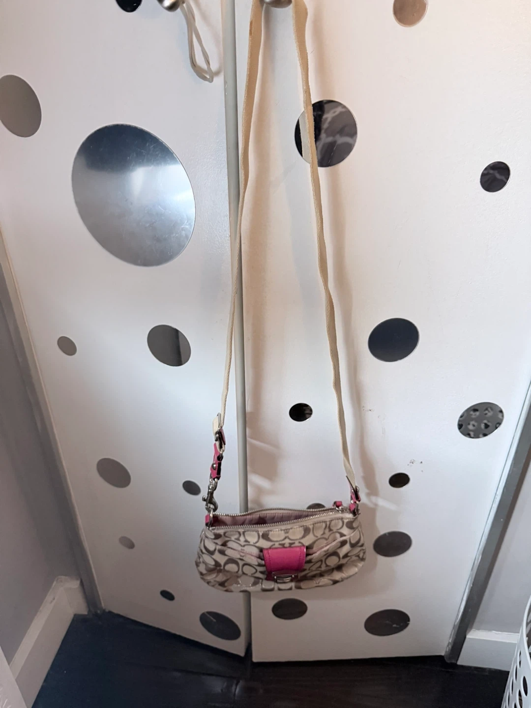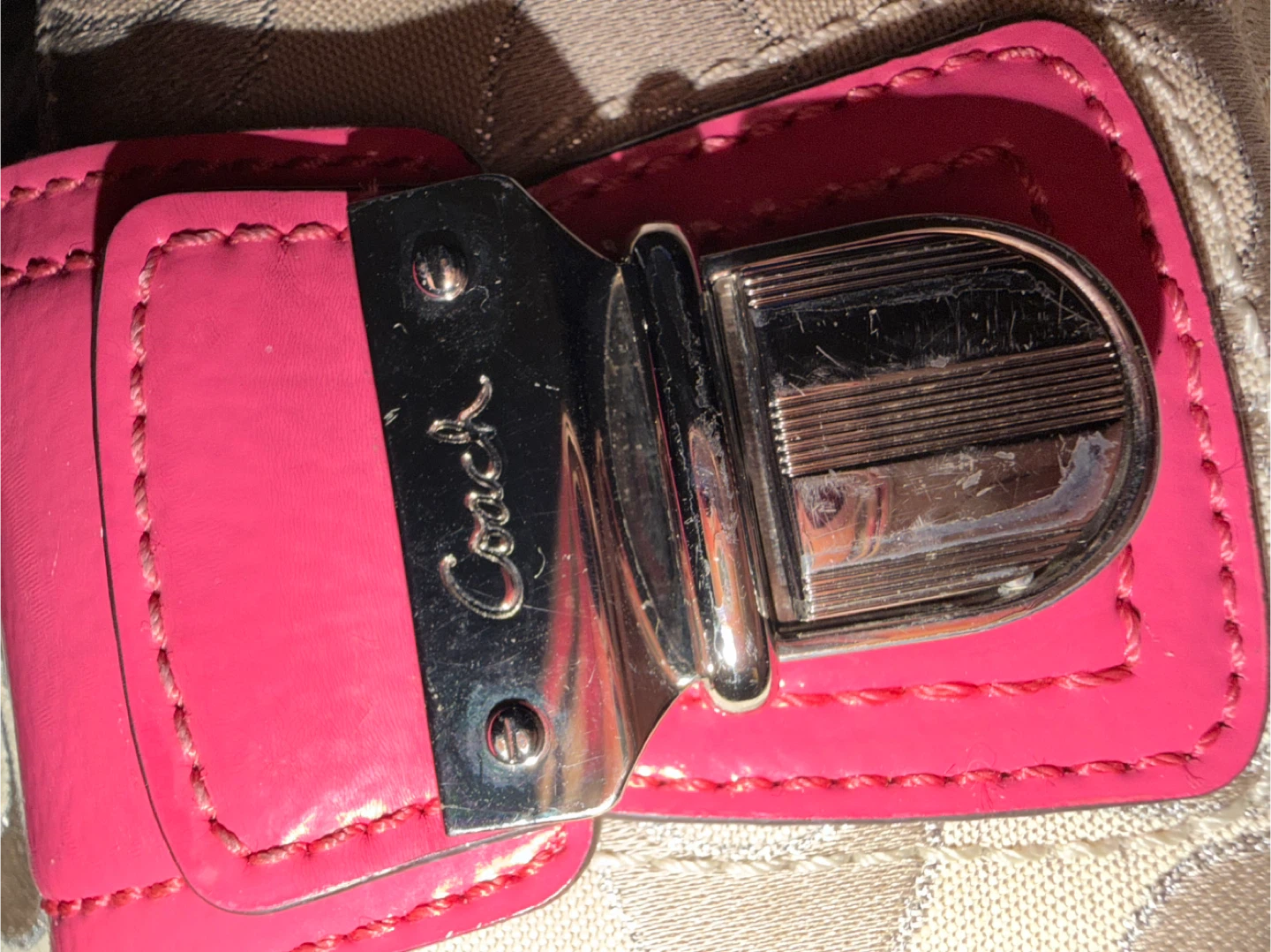 Selling a cute beige Coach shoulder bag with a signature canvas pattern and pink leather trim! It's in good condition and perfect for everyday use.