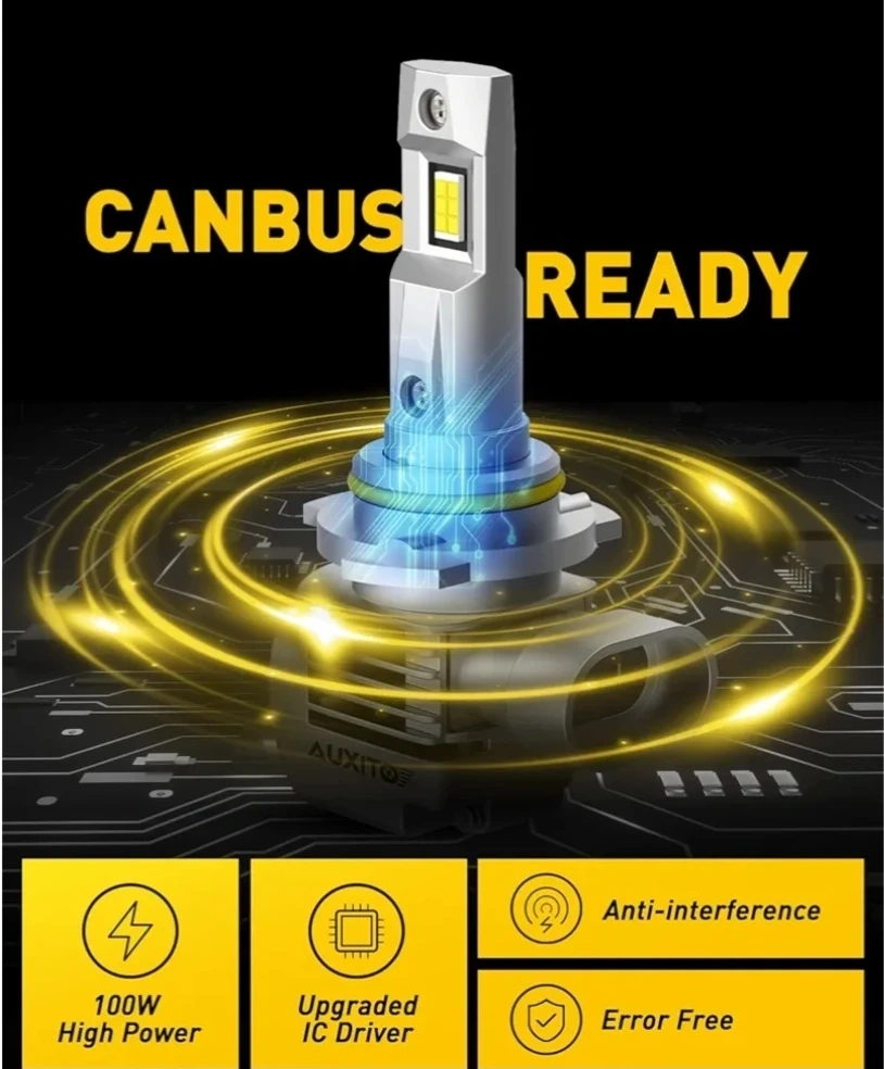 I'm selling a brand new set of AUXITO 9005 LED Headlight Bulbs. These bulbs are designed to be 900% brighter than OEM halogen bulbs, with a 6000K white light output. They feature an efficient cooling system with a copper baseboard and a 12,000 RPM cooling fan, all in an aluminum material. These bulbs are also CANBUS ready and anti-interference, with a 100W high power and an upgraded IC driver.