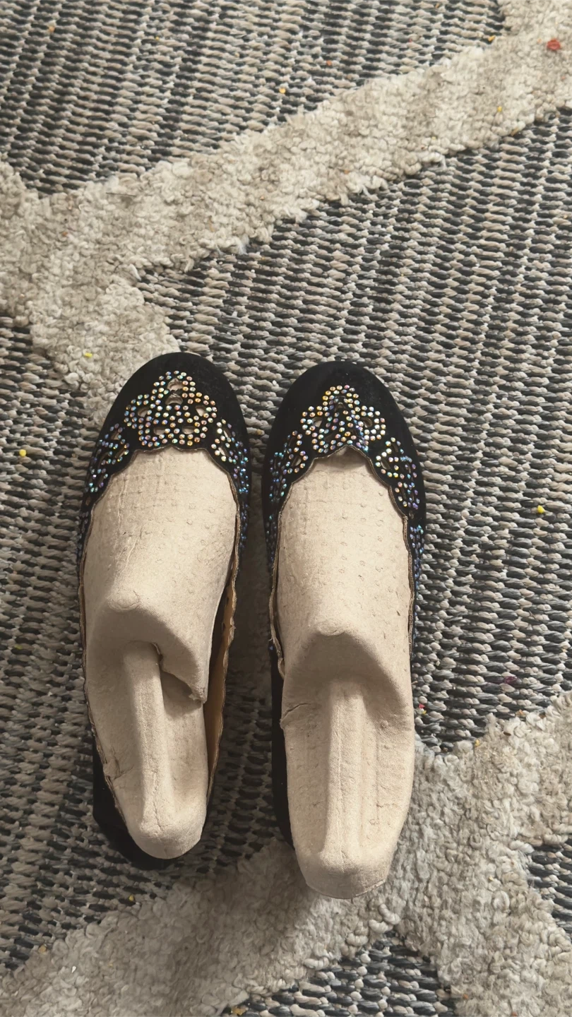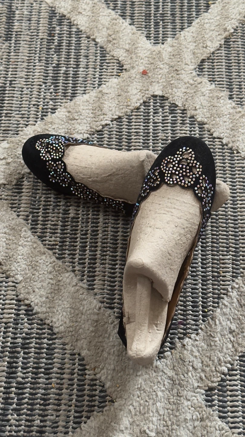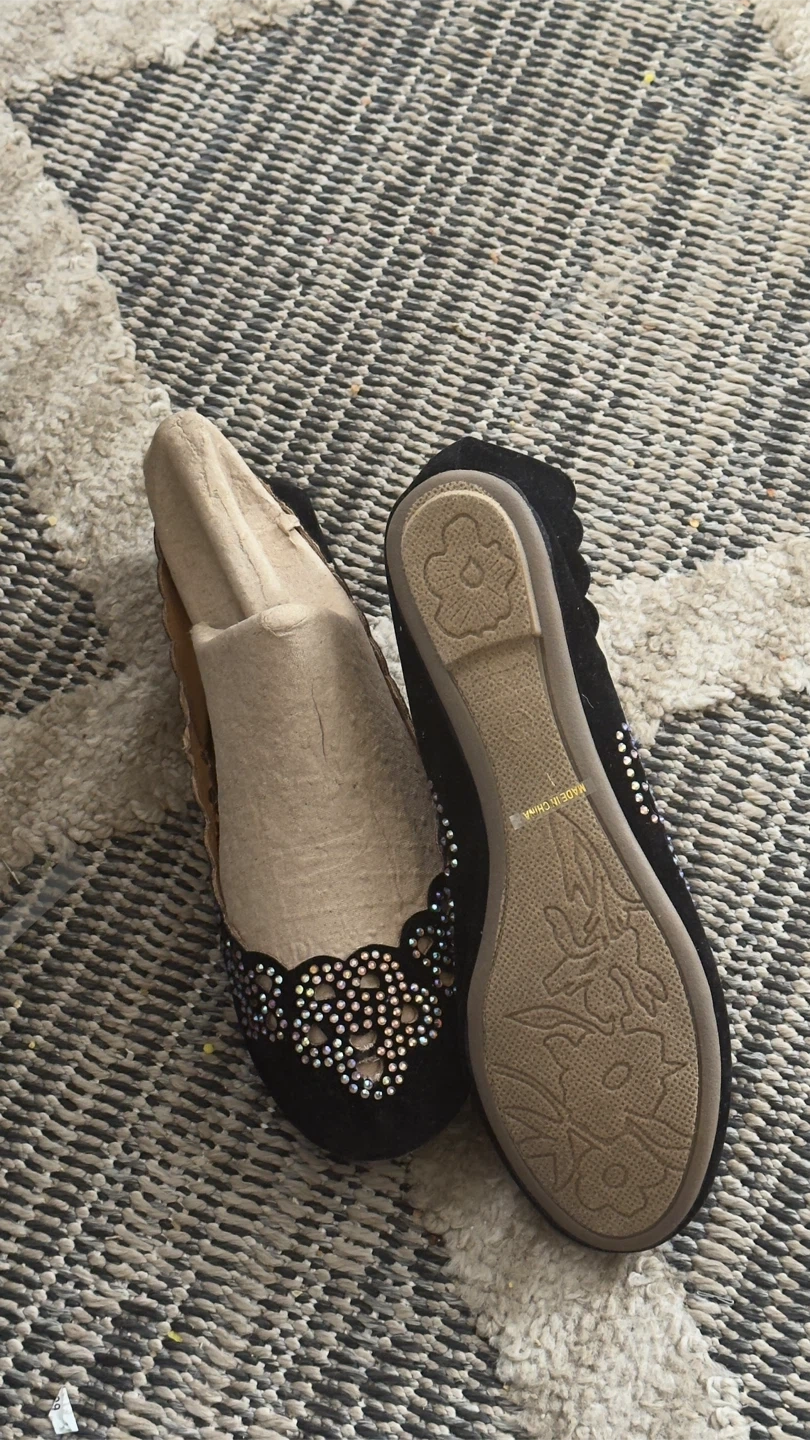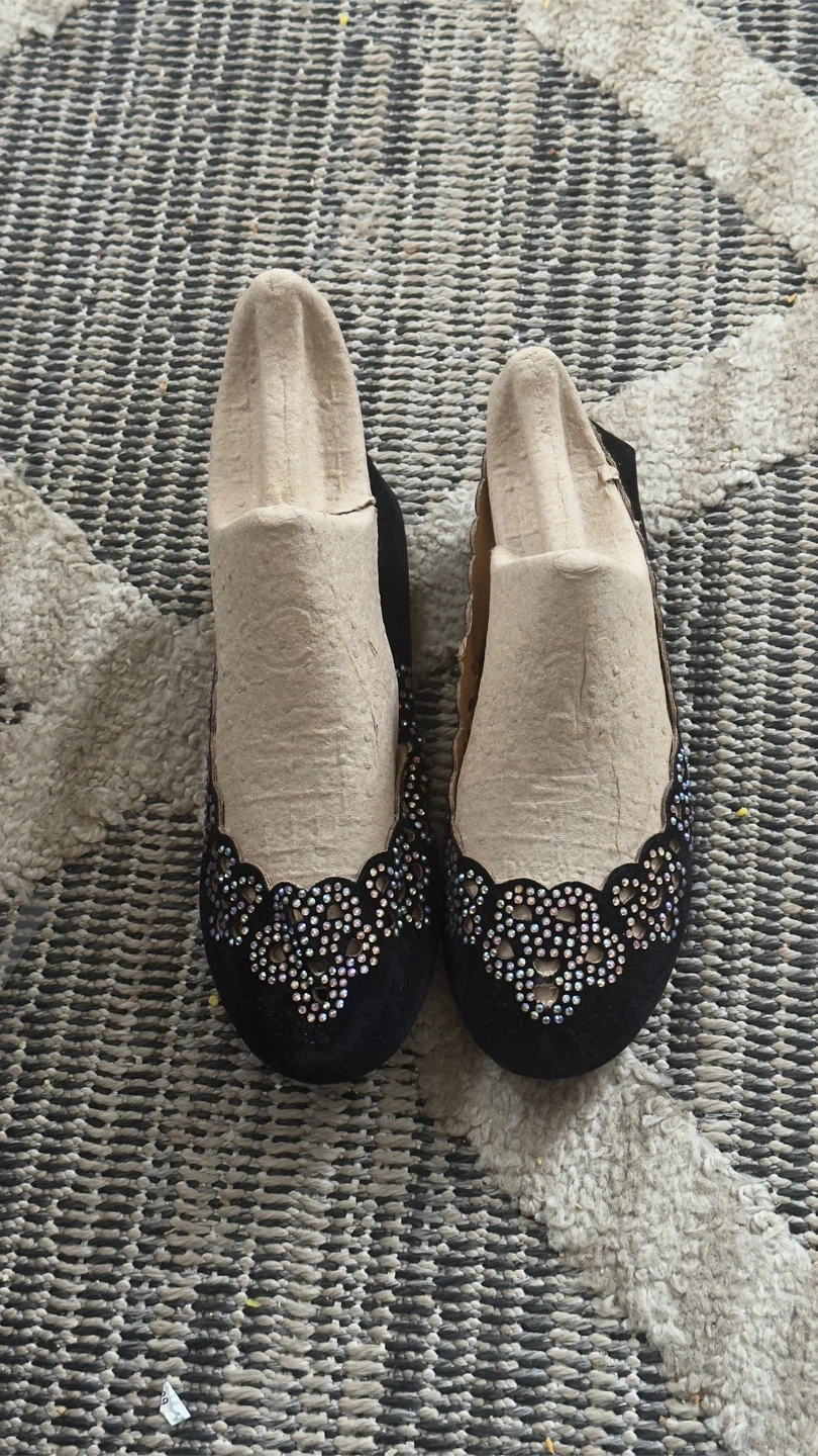 These are a pair of black ballet flats with rhinestone embellishments around the edges. They appear to be in good condition and ready for a new owner!