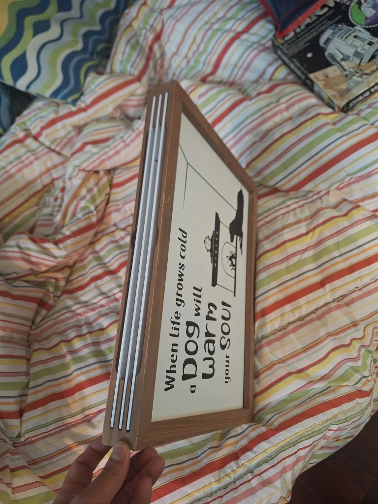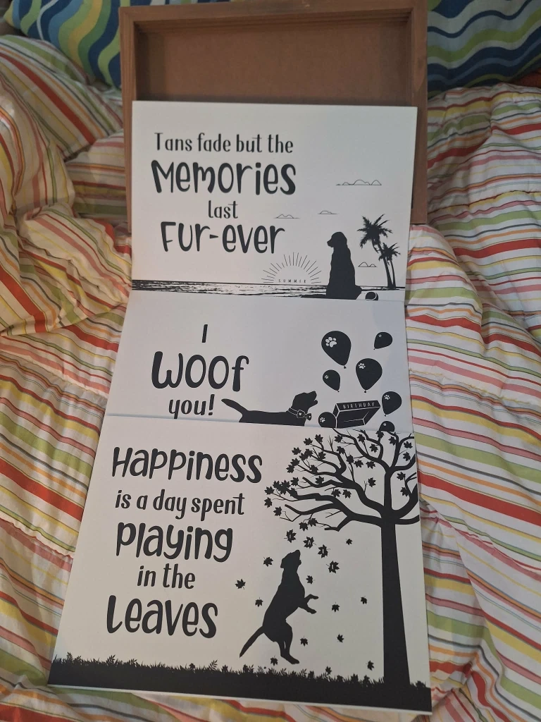 Here's a cute set of dog-themed wall art! Perfect for adding a touch of warmth and personality to any room. The set includes several pieces with adorable sayings and designs. "When life grows cold a Dog will warm your SOUL", "Tans fade but the Memories last FUR-ever", "I Woof you!", "Happiness is a day spent playing in the Leaves", "Sometimes you've just got to stop and Sniff the Flowers", and "There is no greater Gift than the Love from your Dog"