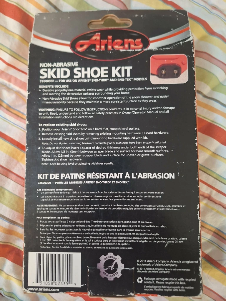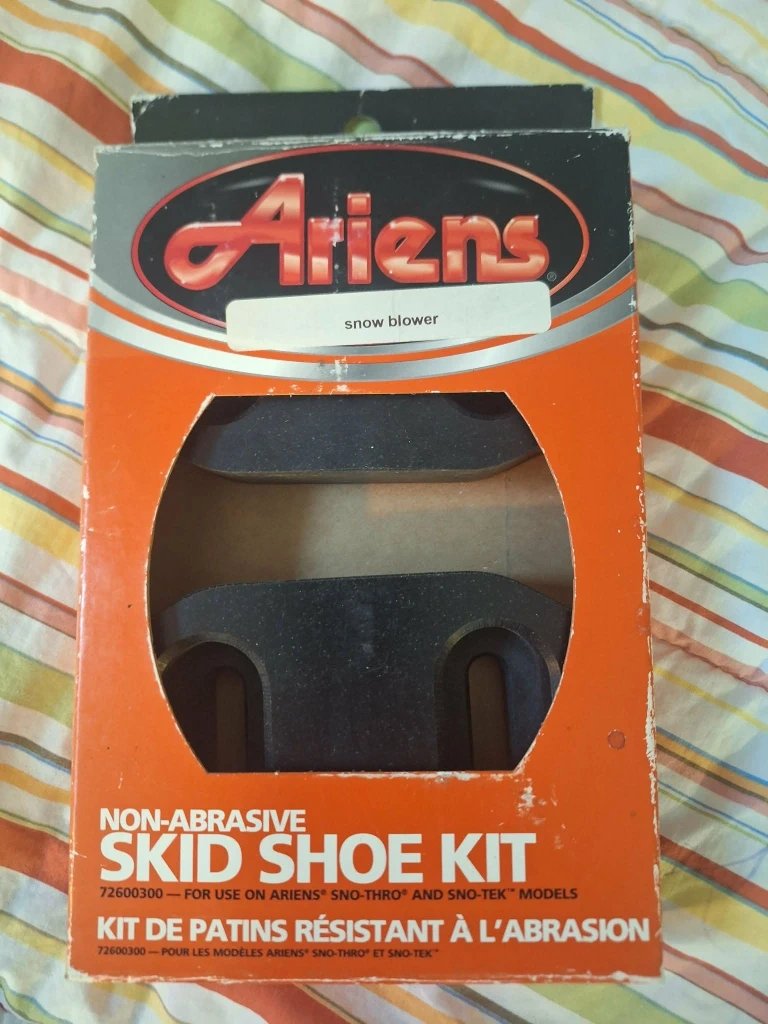 Selling an Ariens non-abrasive skid shoe kit, model 72600300. This kit is designed for Ariens Sno-Thro and Sno-Tek models. It includes durable polyethylene material meant to wear while protecting surfaces around your home. These skid shoes allow for smoother operation of the snow thrower and easier maneuverability as they maintain a more consistent surface. Box included!
